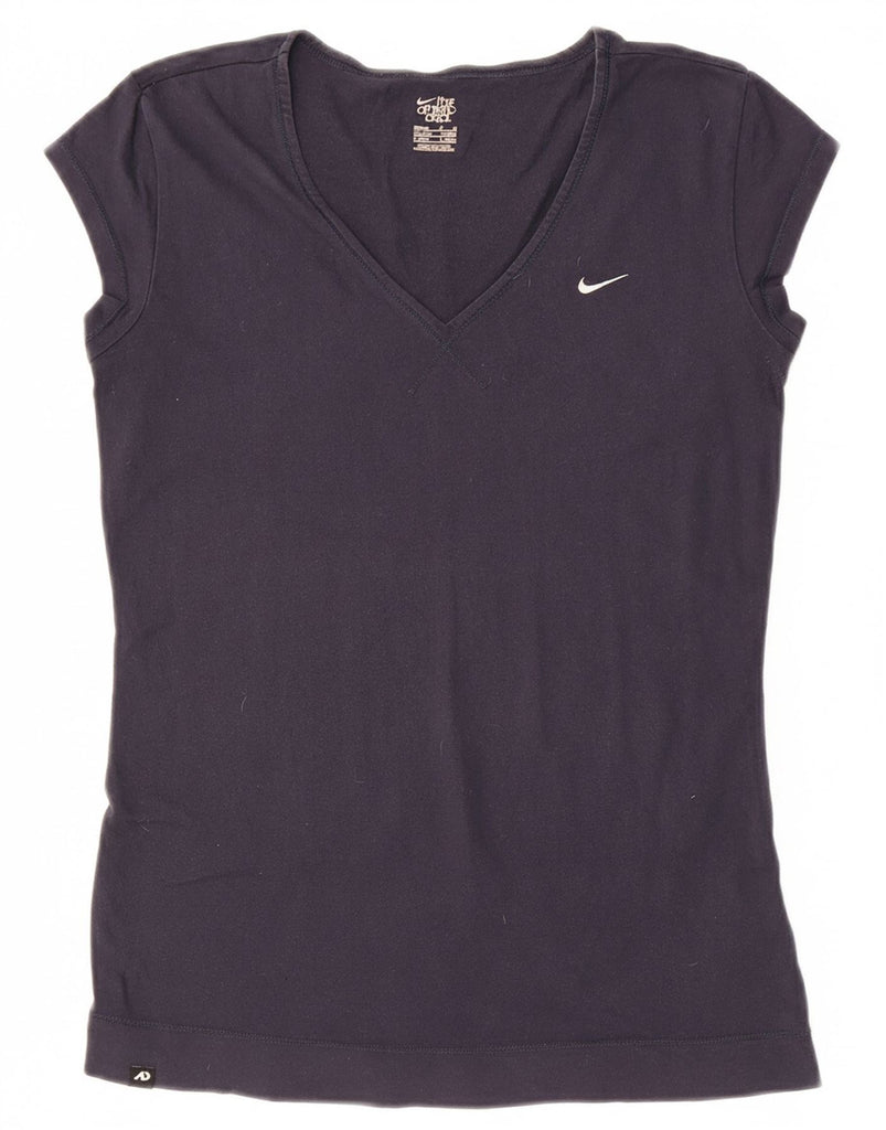 - AI Description: This Nike womens T-shirt top is crafted from soft navy blue cotton jersey. The fabric offers a lightweight and breathable texture, ensuring comfort. It features a flattering V-neckline and classic short sleeves. A regular fit provides an easy pullover style. The iconic Nike logo adds a distinctive branded detail.