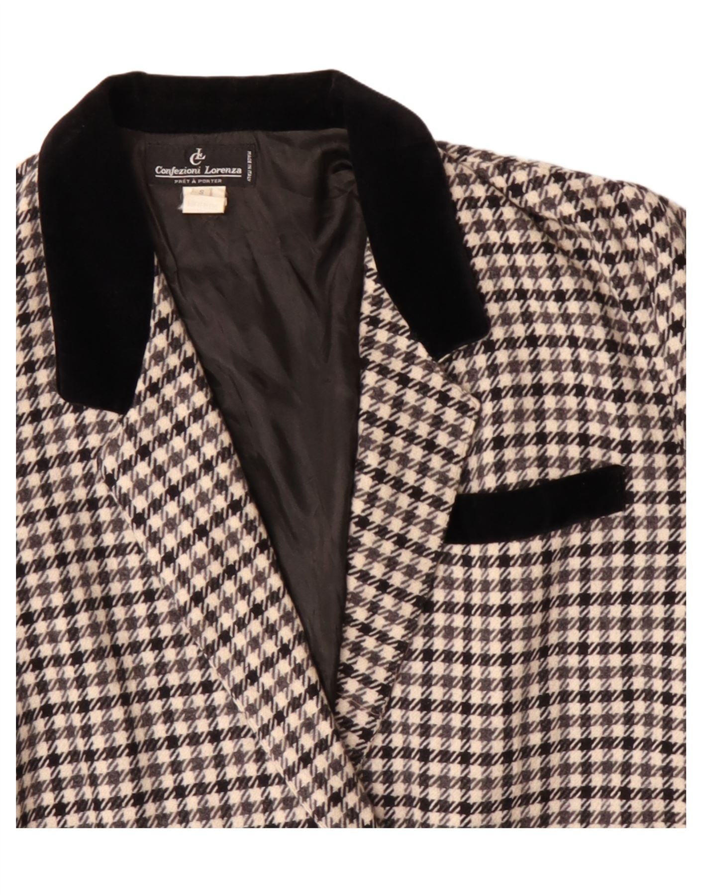 - Description de l'IA : Cette veste blazer vintage pour femme est dotée d'un tissu tissé pied-de-poule classique noir et blanc. L'encolure et les bordures des poches sont confectionnées en velours noir luxueux. Il arbore un devant à double boutonnage avec fermeture boutonnée, offrant une silhouette raffinée. Les manches longues et la coupe régulière assurent un port confortable. Cette veste doublée comprend des poches pratiques, alliant style et fonctionnalité.