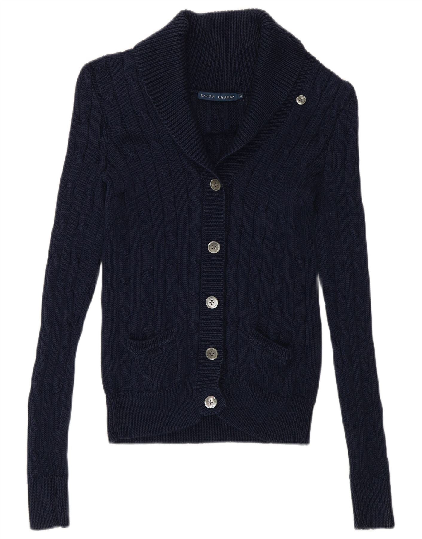 - Description de l'IA : Ce pull cardigan Ralph Lauren pour femme est confectionné à partir d'un riche tissu en maille torsadée bleu marine. Il présente un col châle classique et une fermeture entièrement boutonnée sur le devant. Les manches longues se terminent par des poignets soignés. La coupe régulière offre un port confortable. Deux poches avant ajoutent des détails pratiques. Le motif en tricot torsadé offre un intérêt texturé. Les boutons ton sur ton complètent le look raffiné.