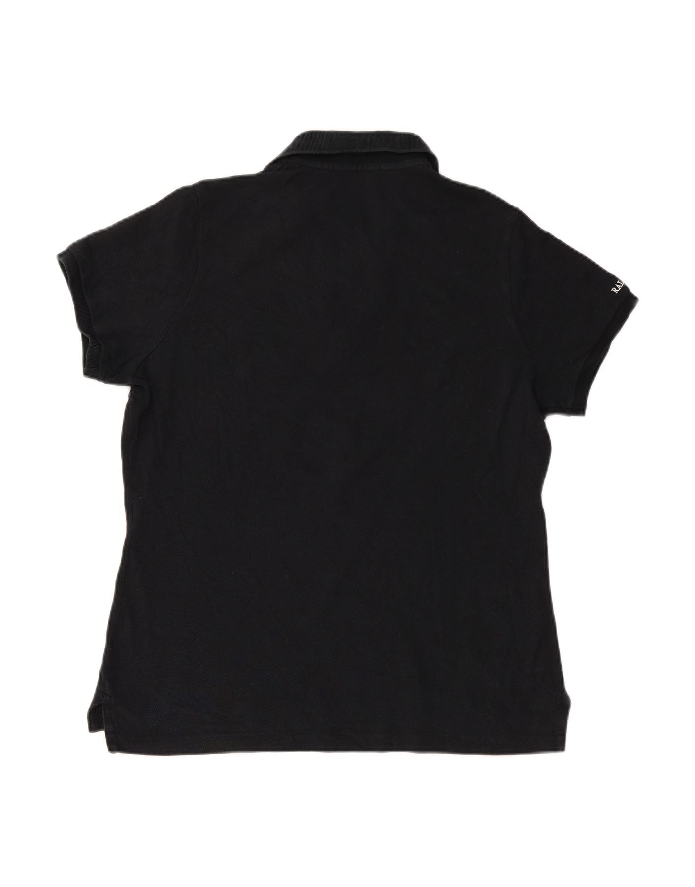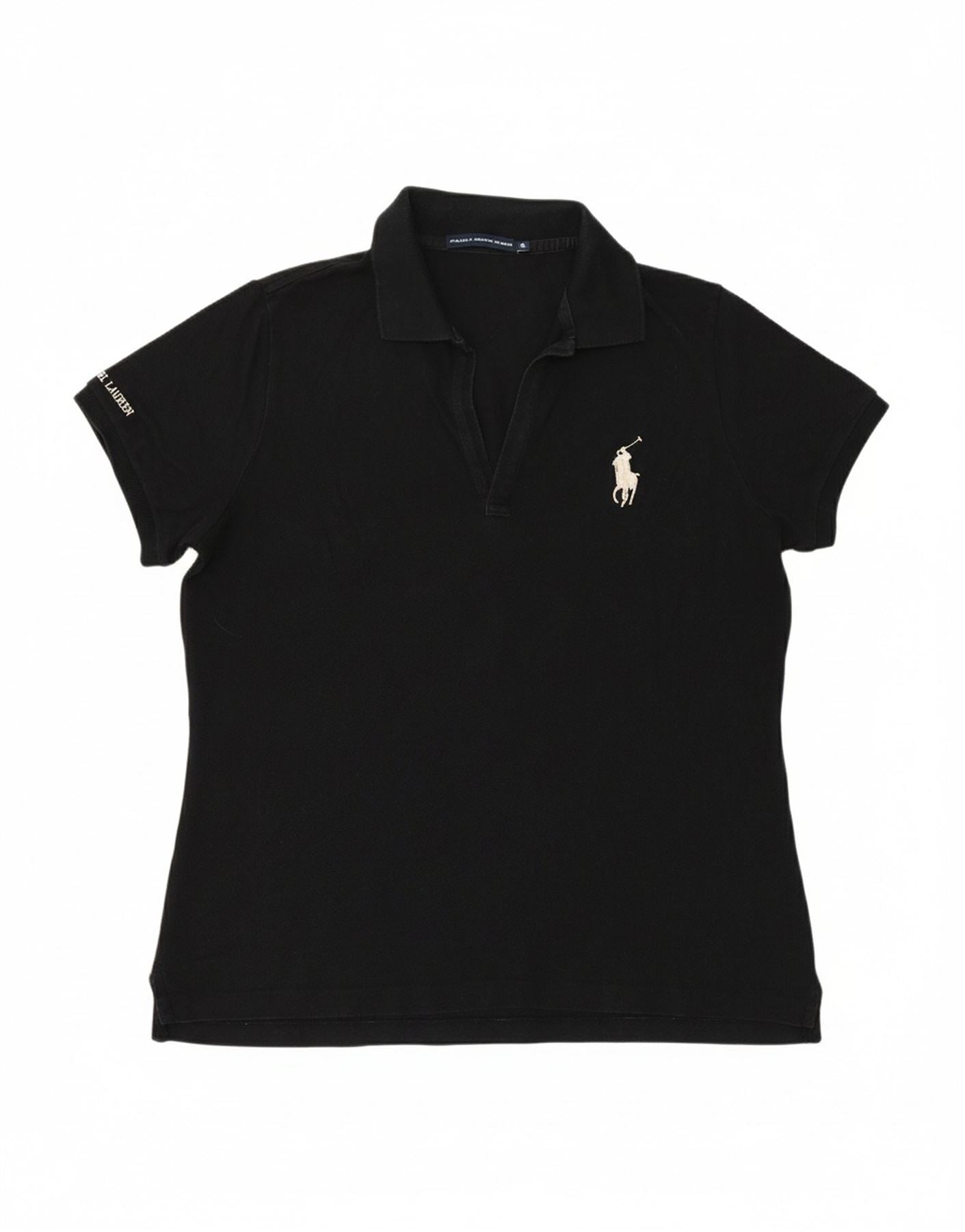 - AI Description: This Ralph Lauren womens shirt is crafted from a black knit fabric. It offers a comfortable regular fit with a touch of stretch. The collared neckline and short sleeves provide a smart yet casual silhouette. It features a button closure down the front. Subtle embroidered accenting adds a refined detail. Practical pockets enhance its functional design. This piece is perfect for versatile styling.