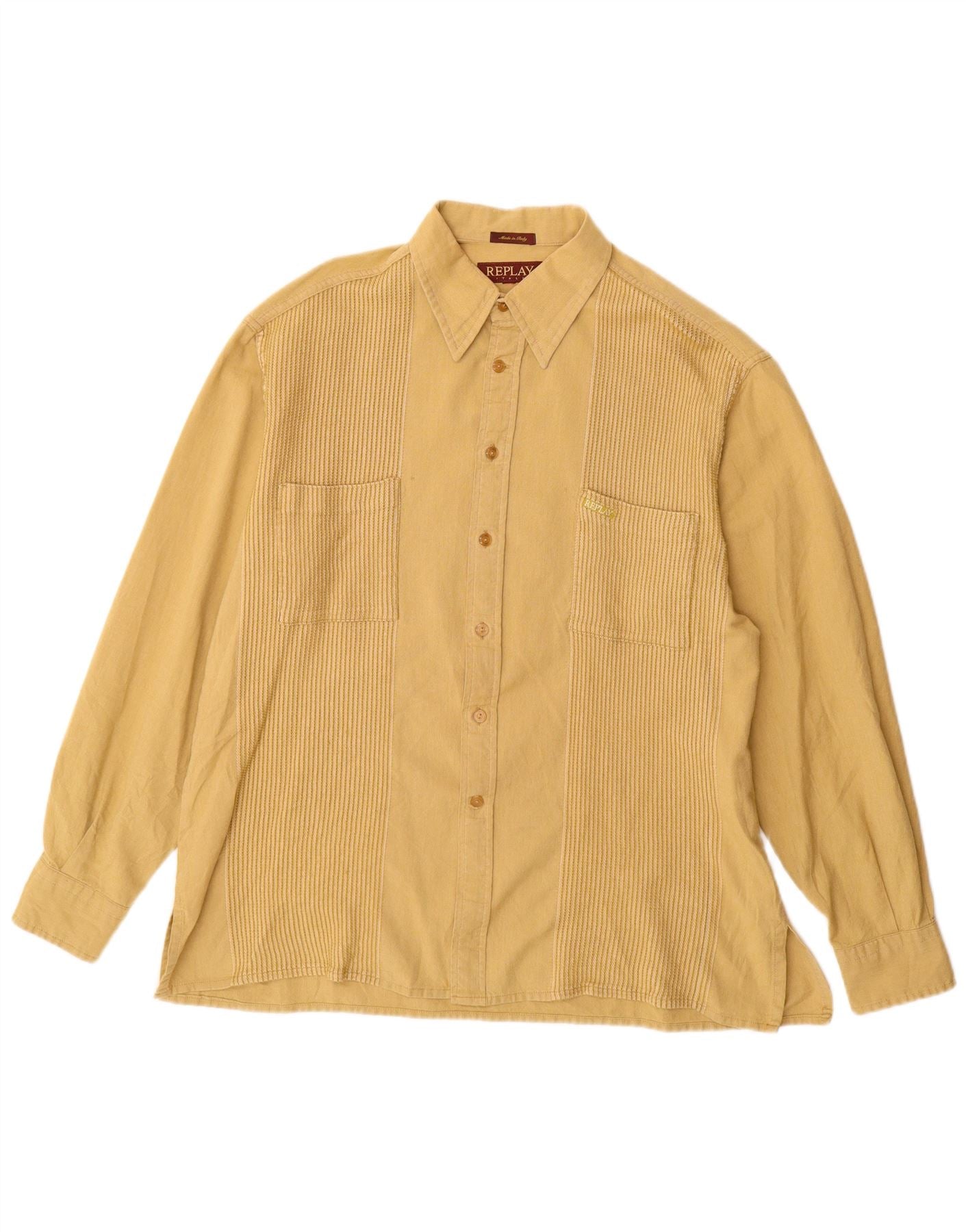 - Description de l'IA : Cette chemise pour homme Replay est confectionnée en velours côtelé beige, offrant une texture côtelée distinctive. Il présente une encolure à col classique et un devant entièrement boutonné. Manches longues terminées par poignets boutonnés. Deux poches poitrine ajoutent des détails pratiques. La coupe régulière assure un port confortable. Des boutons ton sur ton complètent le design, offrant un look cohérent et élégant.
