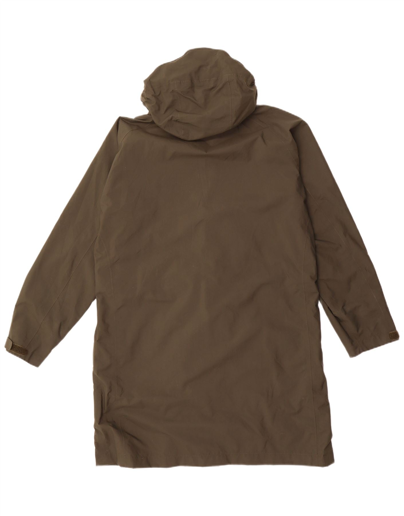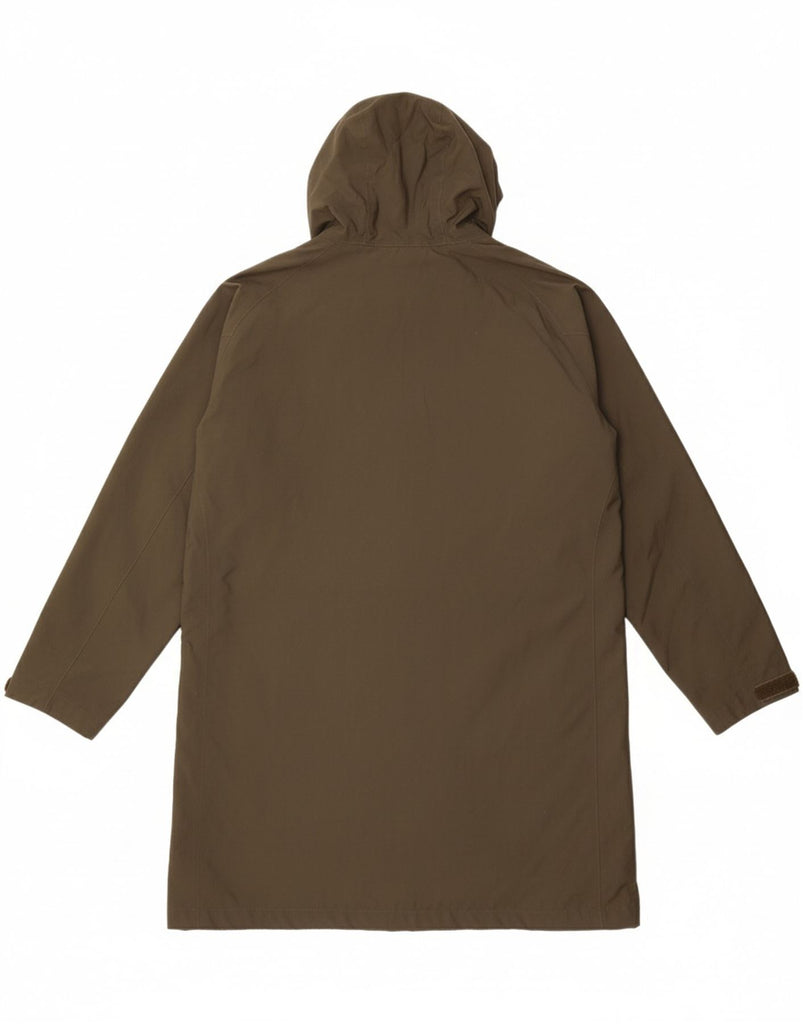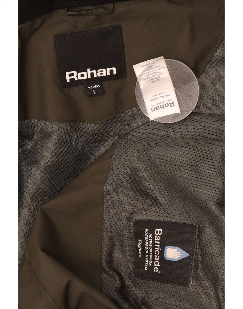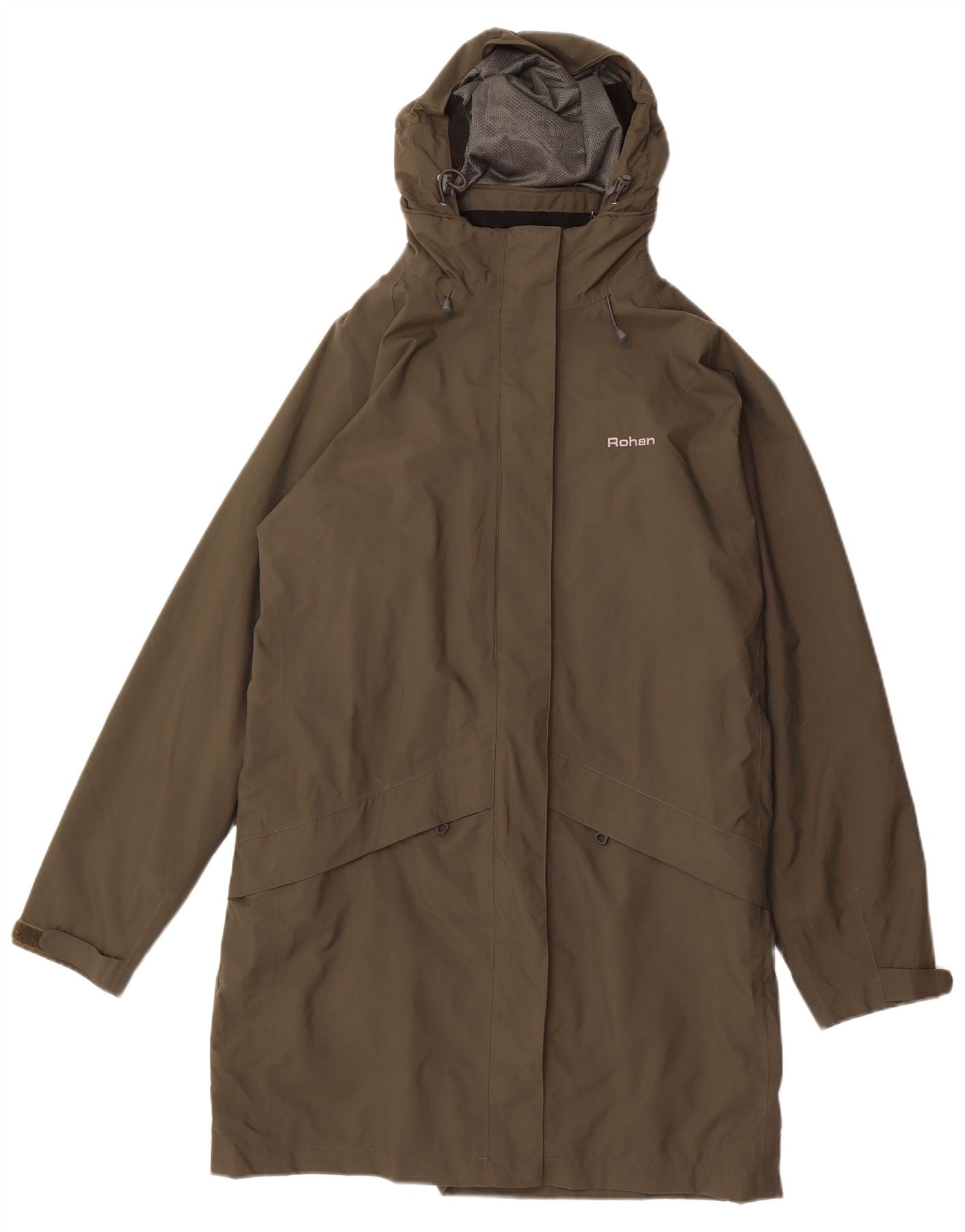 - AI Description: This Rohan womens waterproof jacket is crafted from durable khaki polyester, featuring a breathable PU hydrophilic membrane. Its full zip closure and high neck offer excellent protection. A fixed hood and long sleeves provide complete coverage. This regular fit jacket includes practical pockets, perfect for outdoor activities.