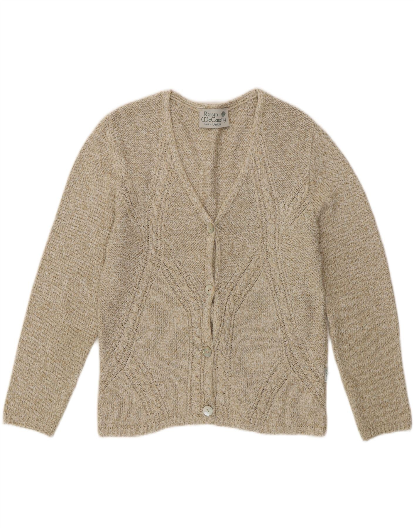- Description de l'IA : Ce pull cardigan Roisin McCarthy pour femme est confectionné à partir d'un tricot de coton mélangé beige doux. Il présente une encolure en V classique et un devant entièrement boutonné. Les manches longues et la coupe régulière assurent un port confortable. La texture tricotée comprend de subtils détails de torsades sur les panneaux avant. Ce style classique offre à la fois confort et élasticité, ce qui en fait une pièce polyvalente à superposer.