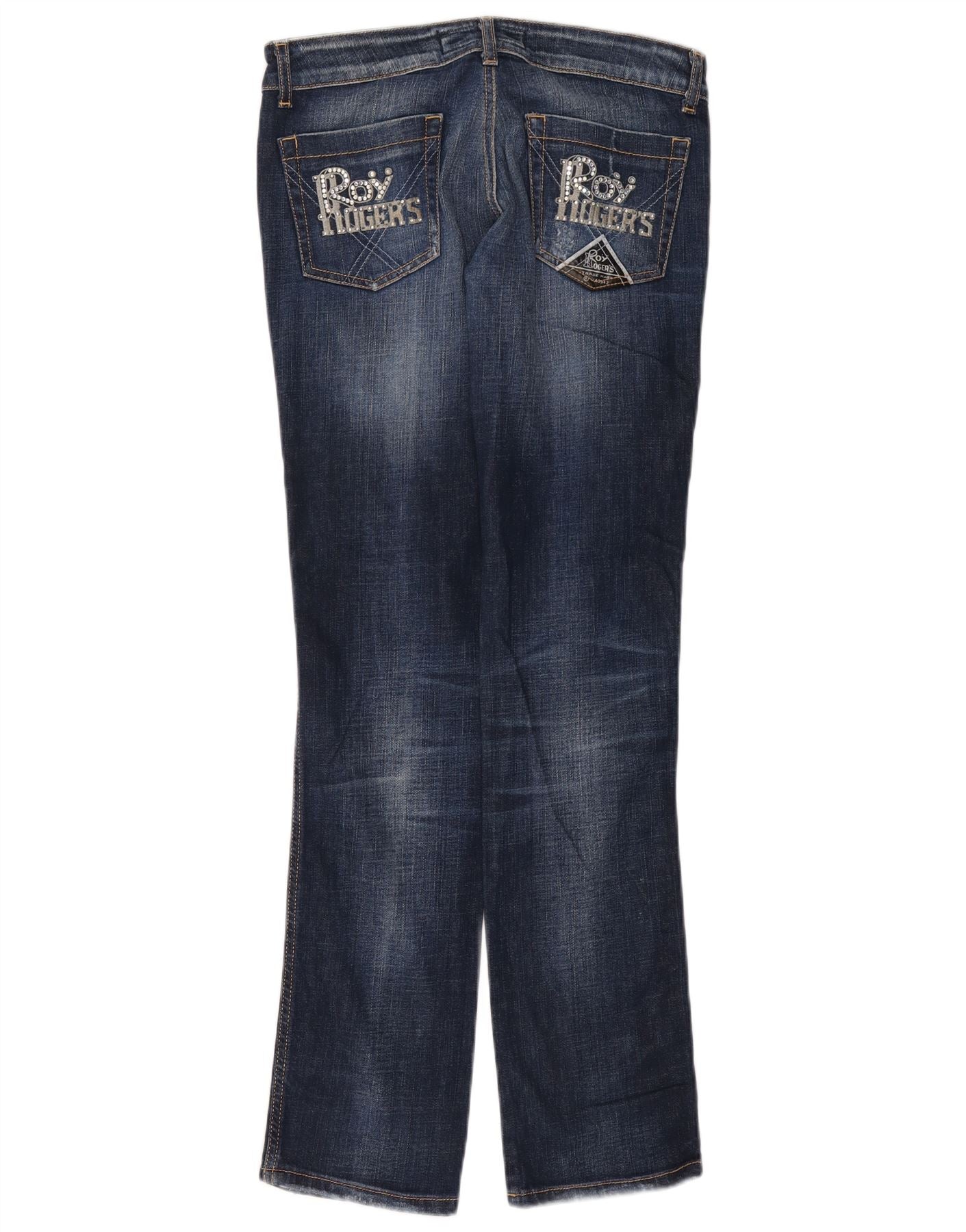 - Description de l'IA : Ce jean Bootcut pour femme Roy Rogers est confectionné en denim bleu avec une finition vieillie. Ils présentent une taille basse et une fermeture boutonnée. La coupe régulière offre du confort. Les jambes bootcut s'évasent doucement à partir du genou. Des poches pratiques sont incluses. Des accents de strass ornent les poches arrière, ajoutant une touche design distinctive.