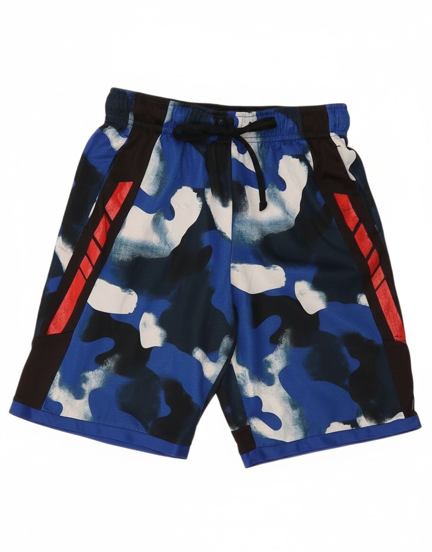 - Description de l'IA : Ce short Russell pour garçons est fabriqué à partir d'un mélange de polyester respirant, idéal pour les vêtements actifs. Ils présentent un motif de camouflage bleu dynamique, incorporant des nuances de noir et de blanc. Une taille élastiquée avec un cordon de serrage assure un ajustement sûr et athlétique. Les poches latérales offrent un rangement pratique. Des bretelles rouges courent sur les côtés, ajoutant un détail visuel saisissant. Le design privilégie le confort et le mouvement pour les activités sportives.