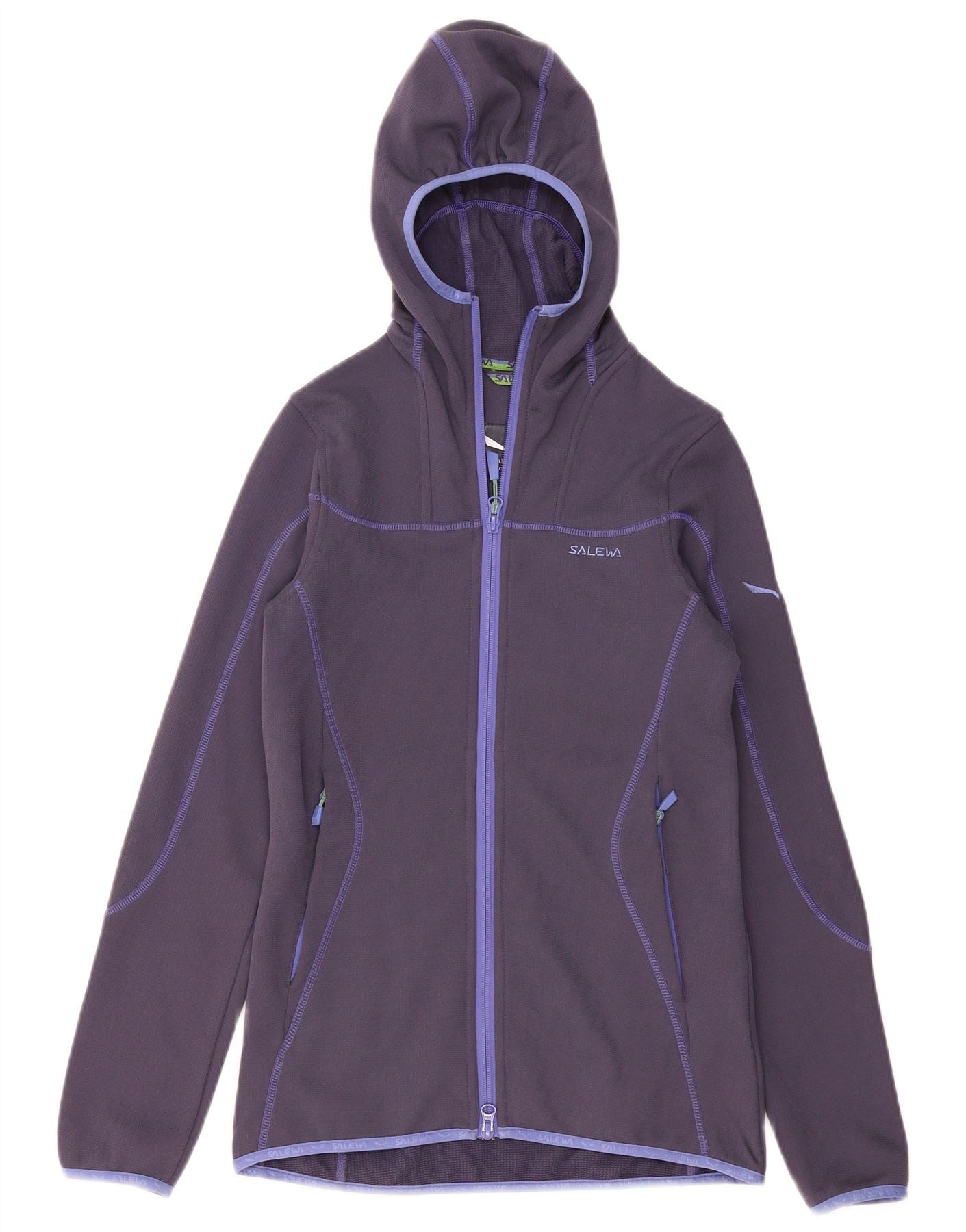 - Description de l'IA : Ce pull à capuche zippé Salewa pour femme est fabriqué en polaire de polyester respirant. Il présente une riche teinte violette avec une fermeture éclair et une bordure bleues contrastées. Le design à capuche et le col montant offrent chaleur et couverture. Les manches longues et la coupe régulière assurent le confort. Un subtil logo Salewa ajoute une touche de marque. Cette pièce est idéale pour la randonnée et le sport.