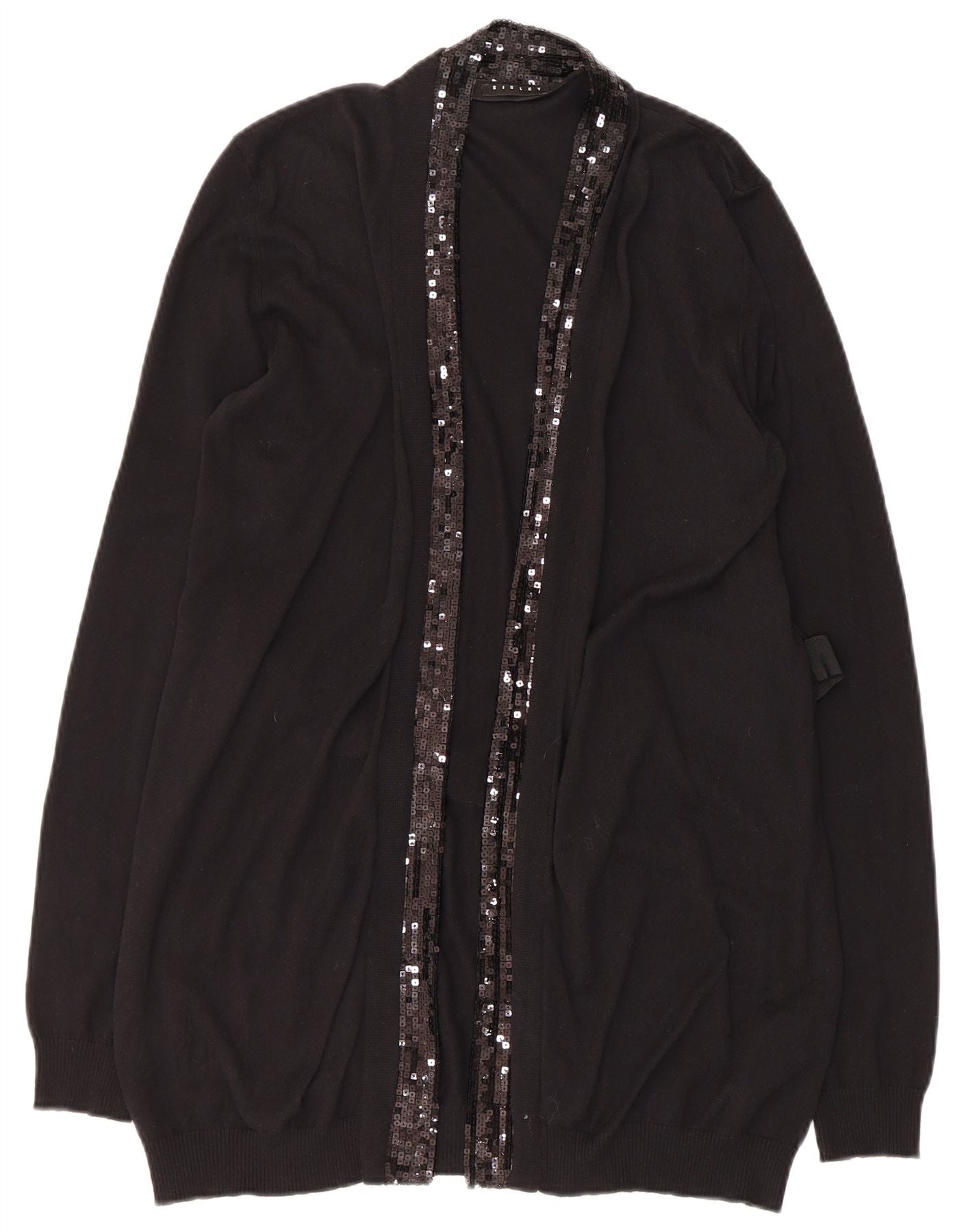 - Description de l'IA : Ce pull cardigan Sisley pour femme est confectionné en maille de coton noire légère. Il présente une encolure en V et des manches longues. Le design ouvert sur le devant est complété par une fermeture à nouer. Des détails de paillettes scintillantes ornent les bords avant, ajoutant une touche de glamour. La coupe régulière assure un port confortable. Ce style classique offre une superposition polyvalente pour diverses occasions.