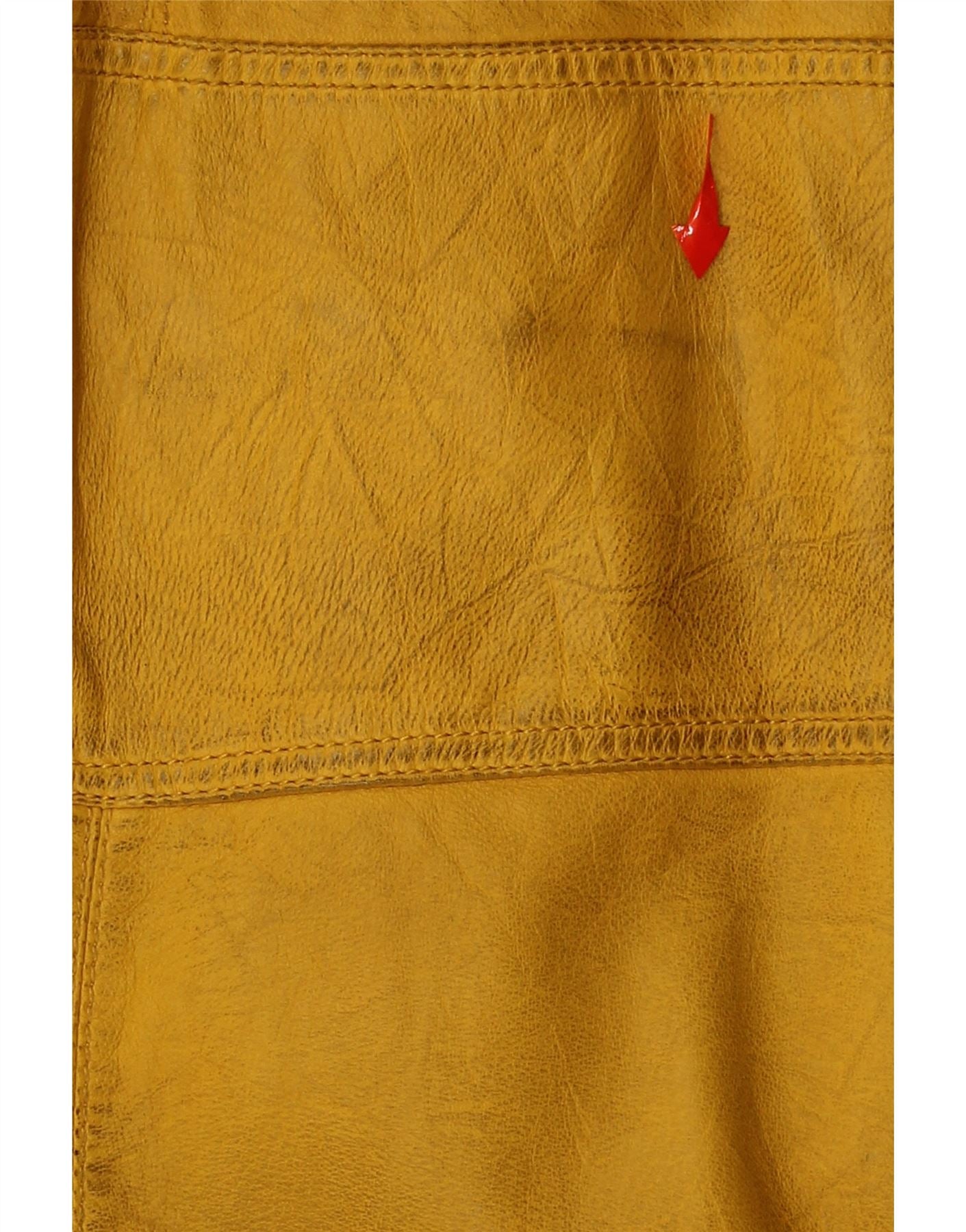 - AI Description: This Strellson men's leather jacket is a stylish motorcycle piece, crafted from 100% leather with a polyester lining. In a striking yellow colour, this regular fit jacket features a collared neckline, long sleeves, and a full zip closure. Accented with a logo and zipped pockets, this pre-owned jacket is in good condition, however, there is minor discoloration all over. Labelled size 54 / XL.