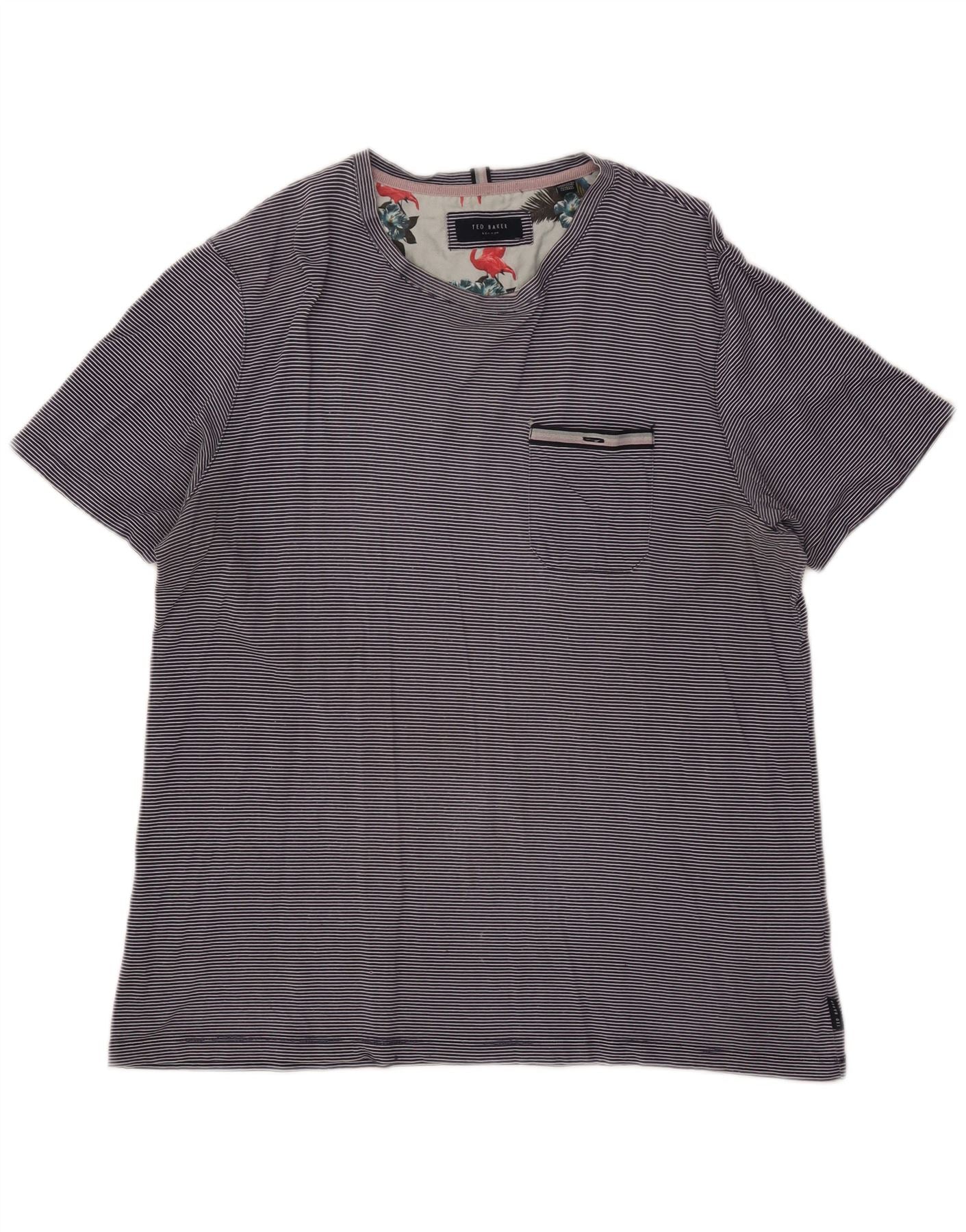 - Description de l'IA : Ce T-shirt pour homme Ted Baker est confectionné dans un tricot de coton gris doux, offrant une sensation de confort. Il présente un motif rayé subtil partout. Une poche poitrine ajoute un détail pratique. Le col rond et les manches courtes offrent une silhouette classique. Sa coupe régulière assure un confort au quotidien. Le col intérieur présente un imprimé graphique distinctif, une touche signature de Ted Baker.