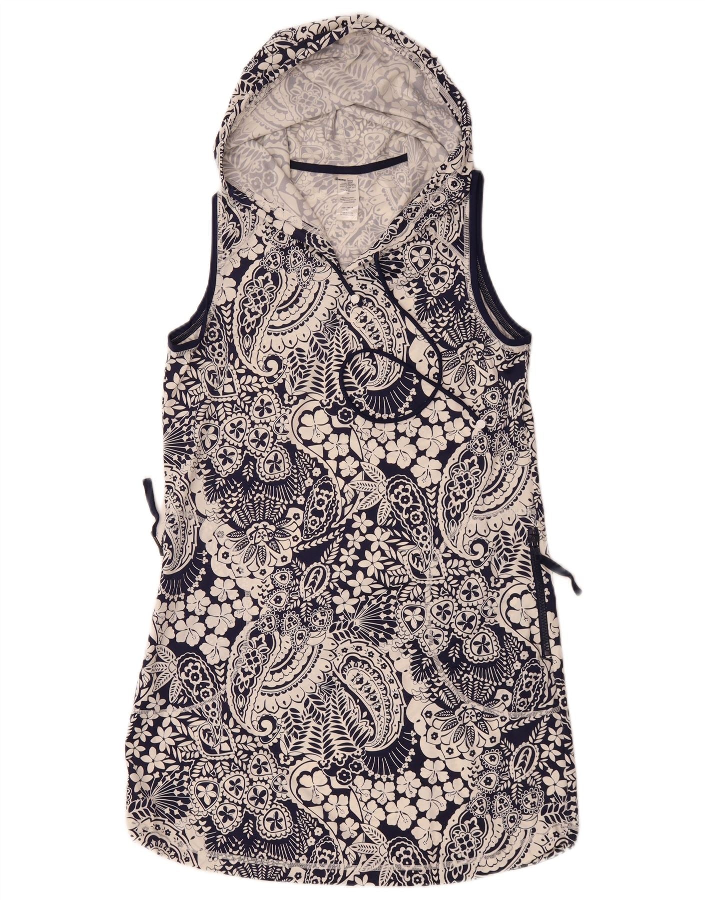 - Description de l'IA : Cette robe à capuche Tommy Bahama pour femme est confectionnée à partir d'un mélange de jersey de polyester doux. Il présente un motif cachemire multicolore vibrant, à dominante bleu marine et blanc. Le design sans manches offre une coupe décontractée. Il comprend une capuche pratique et des poches pratiques. Le style pull assure un port facile. Cette robe coupe classique incarne une esthétique bohème.