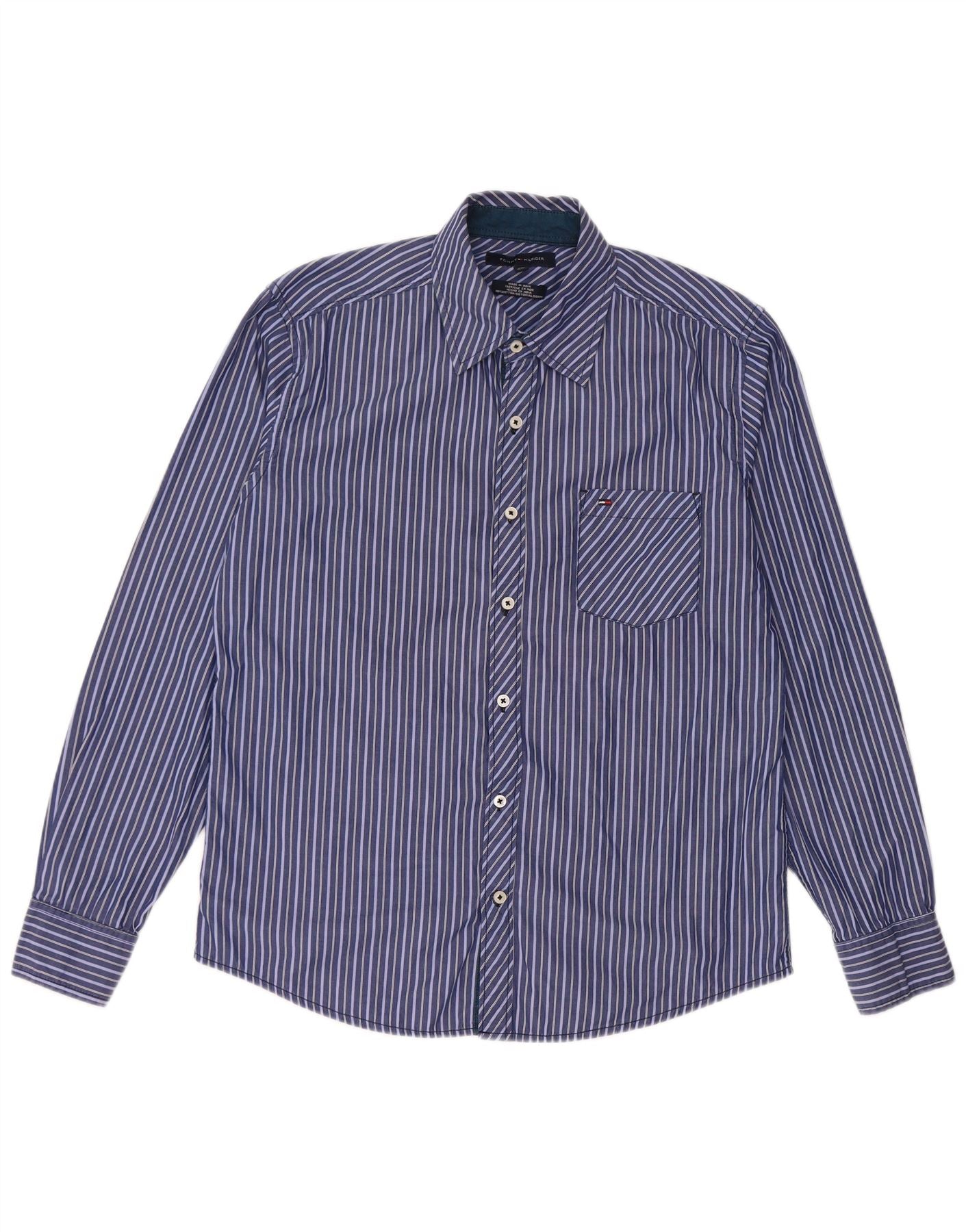 - Description de l'IA : Cette chemise pour homme Tommy Hilfiger est confectionnée à partir de tissu tissé 100 % coton. Il présente un motif rayé bleu classique pour un look intemporel. L'encolure à col et la fermeture entièrement boutonnée offrent un attrait élégant et traditionnel. Des manches longues avec des détails à revers complètent la structure raffinée. Une poche poitrine unique ajoute un style pratique. Cette chemise de coupe classique assure un port confortable.