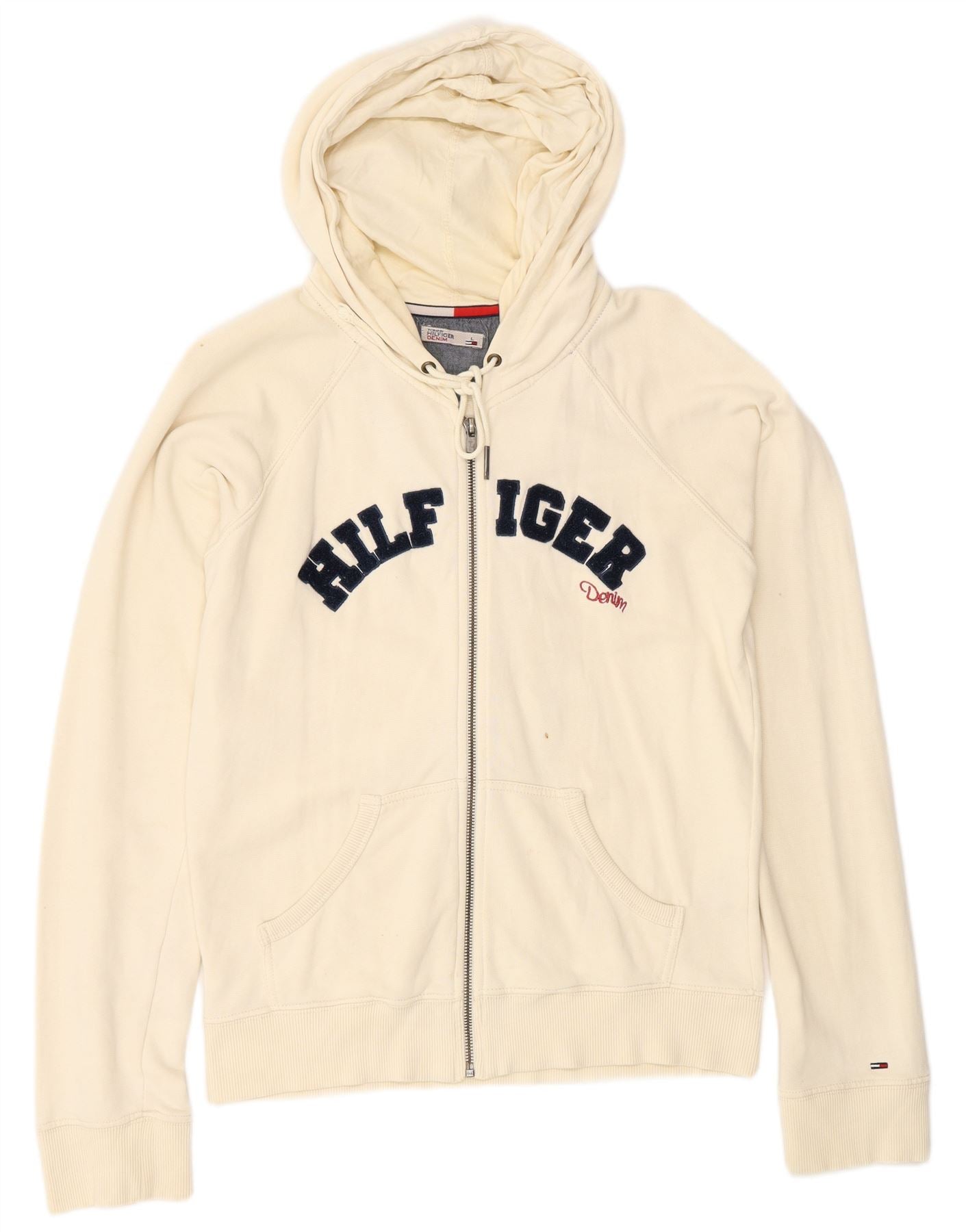 TOMMY HILFIGER Womens Graphic Zip Hoodie Sweater UK 14 Large White Cotton