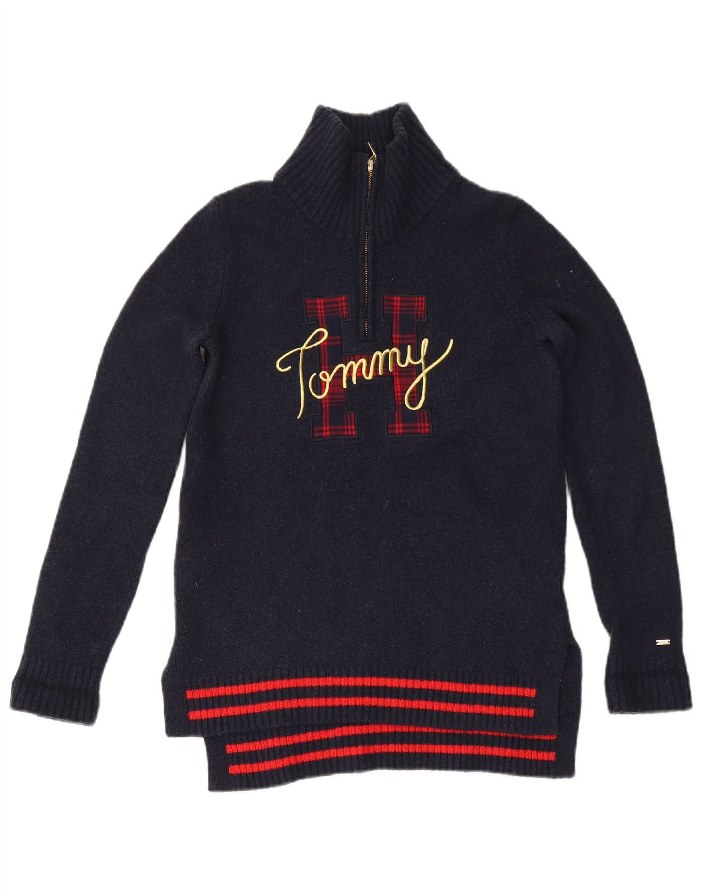 TOMMY HILFIGER Womens Zip Neck Jumper Sweater UK 6 XS Navy Blue Striped