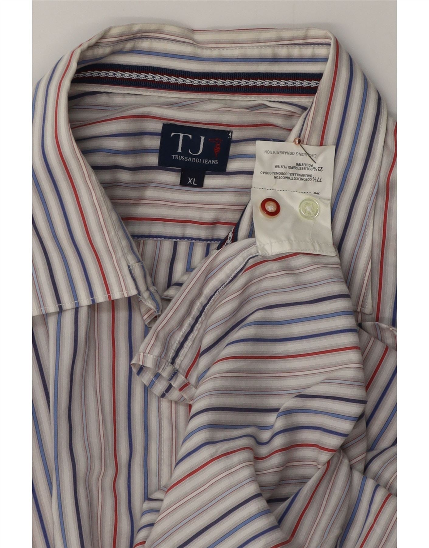 - Description de l'IA : Cette chemise pour homme Trussardi Jeans est confectionnée dans un tissu en coton mélangé confortable. Il présente une encolure à col classique et un devant entièrement boutonné. Le motif rayé multicolore en rouge, bleu et gris offre une esthétique élégante et décontractée. Des manches longues avec poignets boutonnés complètent le design. Sa coupe régulière assure une silhouette confortable et polyvalente.