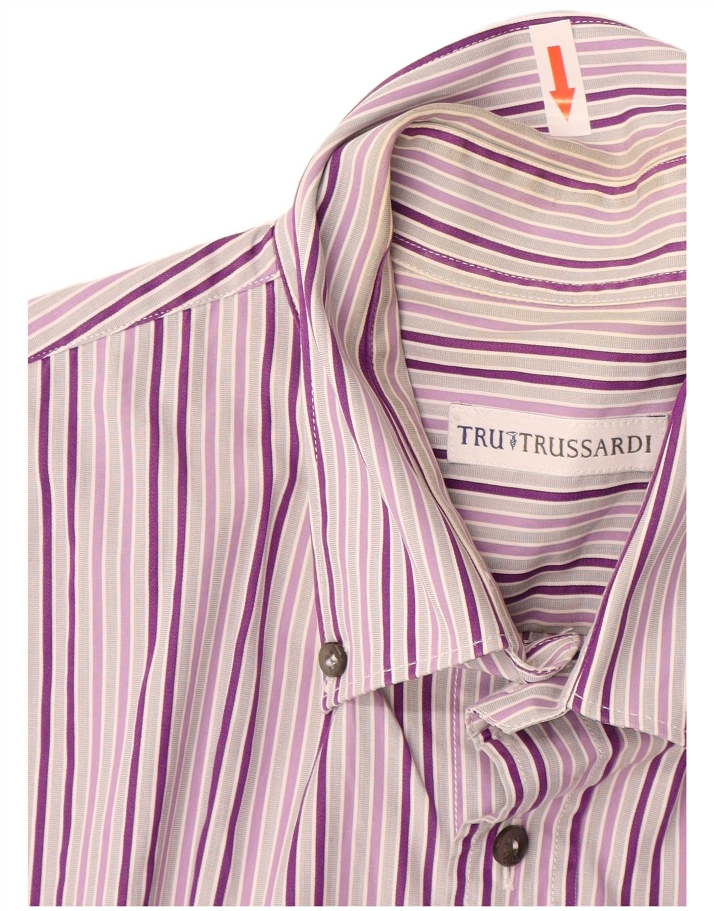 - Description de l'IA : Cette chemise pour homme Trussardi est confectionnée dans un tissu tissé offrant une texture impeccable. Il présente un motif rayé distinctif dans des tons de violet, lilas et gris. L'encolure à col et la fermeture boutonnée offrent un look classique. Les manches courtes et la coupe régulière assurent confort et facilité de port. Une poche poitrine unique ajoute un détail pratique. Cette chemise offre un style à la fois élégant et décontracté.