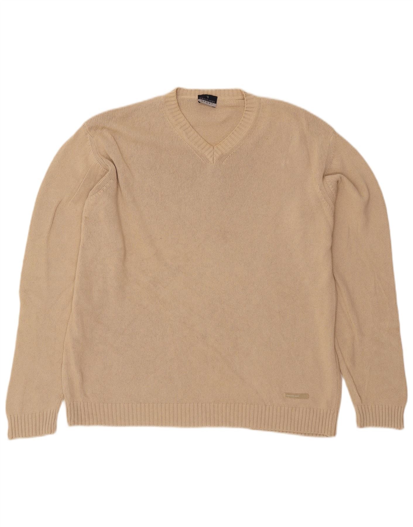 - Description de l'IA : Ce pull à col en V pour homme Trussardi Sport est confectionné à partir de tissu tricoté 100 % coton. Il offre une texture douce et confortable dans une teinte beige polyvalente. Le décolleté en V classique offre un look raffiné. Les manches longues et la coupe régulière assurent un port confortable. Les poignets et l'ourlet côtelés complètent le design du pull. Le tricot uni offre une esthétique épurée et minimaliste. Un subtil détail de marque est présent.