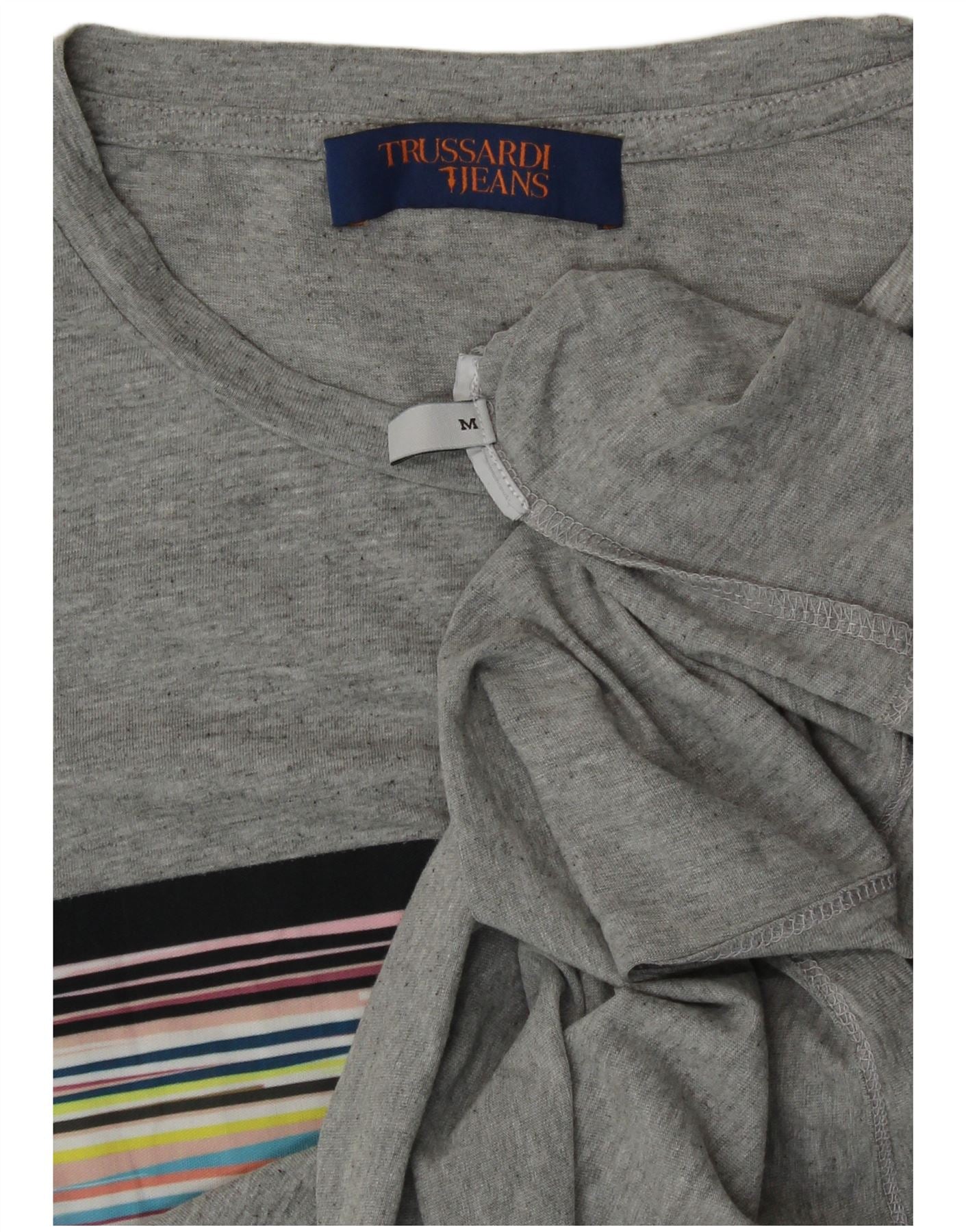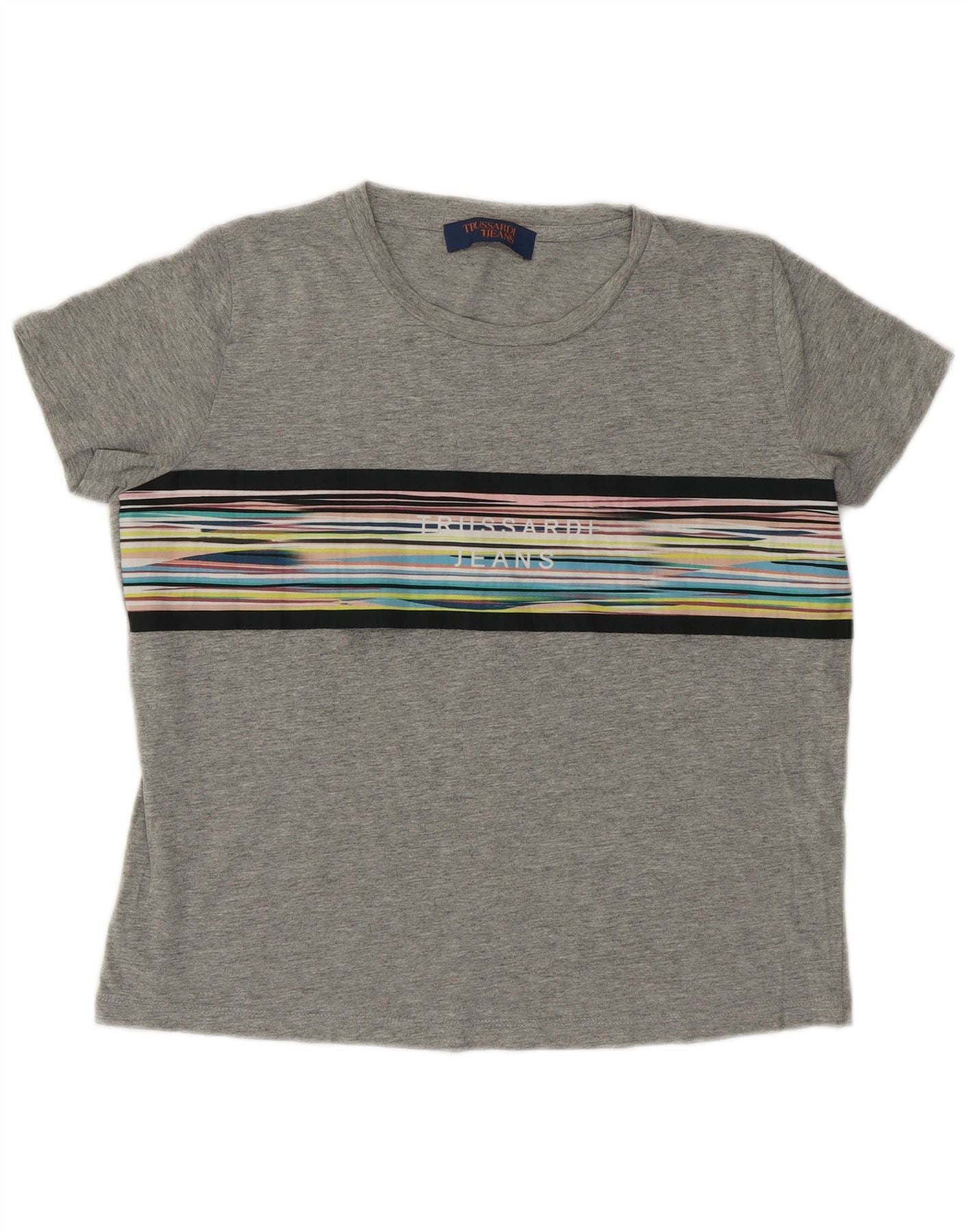 - Description de l'IA : Ce t-shirt graphique pour femme Trussardi Jeans est confectionné en jersey gris doux. Il présente un col rond classique et des manches courtes. Le style pull offre une coupe régulière confortable. Un motif à rayures vibrantes orne le devant et intègre le logo Trussardi Jeans. Cette pièce classique allie confort et accent visuel distinctif.