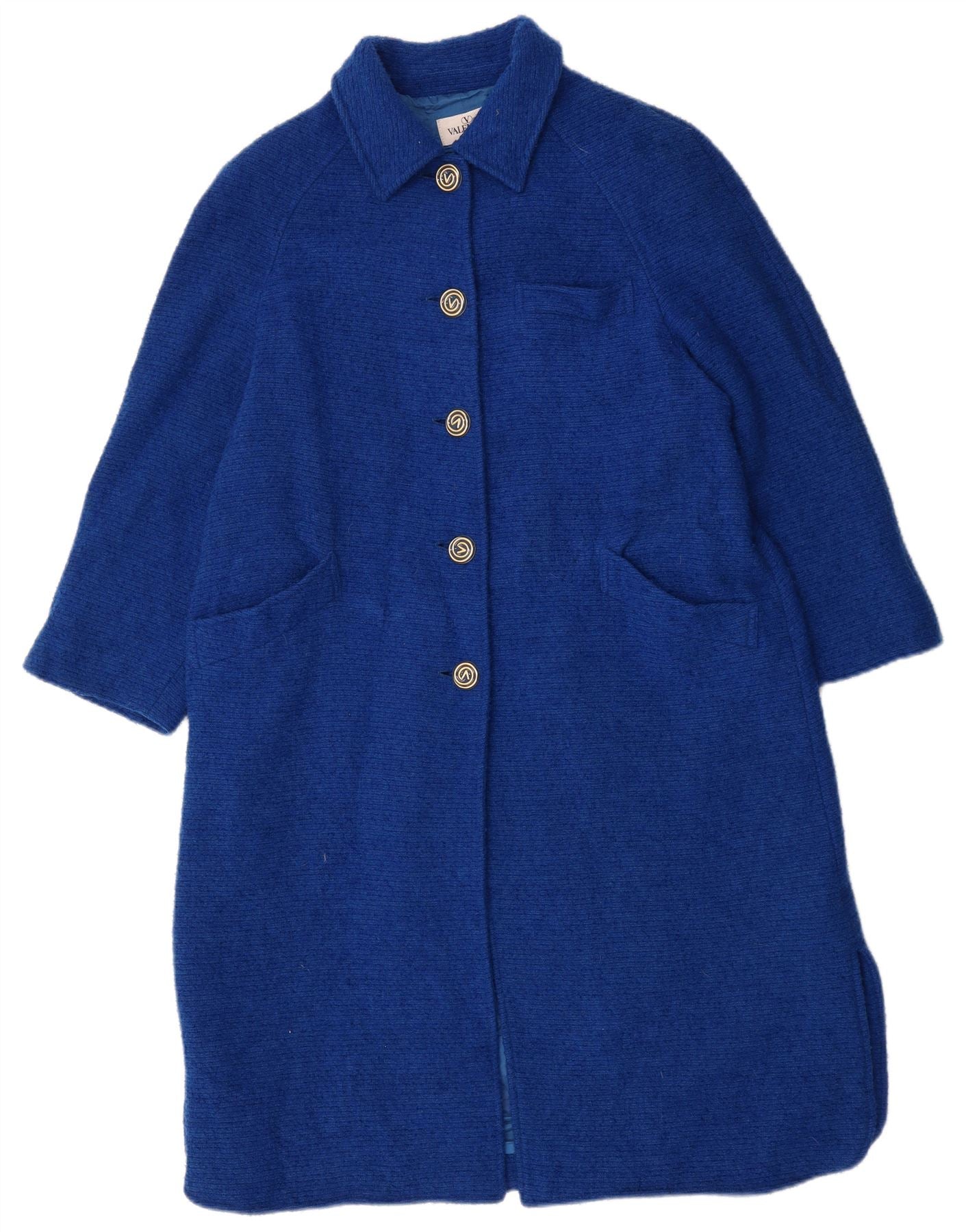 - AI Description: This Valentino womens double-breasted coat is crafted from luxurious blue wool tweed, offering a rich texture and warmth. It features a classic collared neckline and a relaxed fit for comfortable wear. The 3/4 length sleeves add a contemporary touch. A four-button closure and functional pockets provide practical and stylish accents, enhancing its sophisticated silhouette.