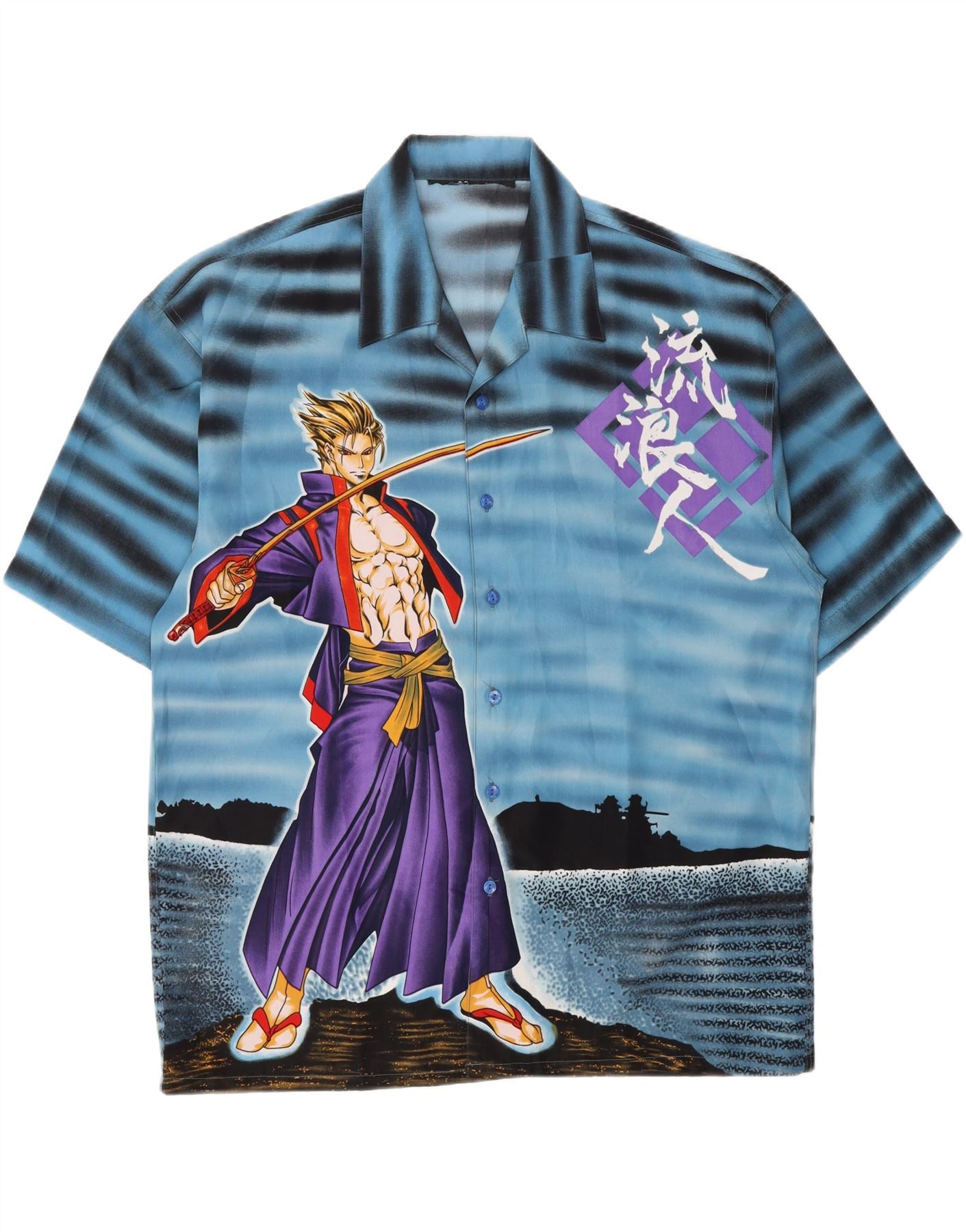 VINTAGE Chemise à manches courtes pour hommes Anime Samurai Grand Bleu