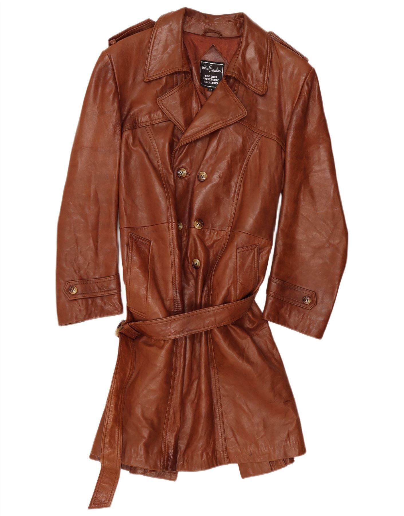 - Description de l'IA : Ce trench-coat en cuir vintage pour homme est confectionné à partir de cuir véritable marron riche. Il présente une fermeture boutonnée classique à double boutonnage et une encolure à col. Des manches longues et une taille ceinturée définissent la silhouette. Les poches pratiques ajoutent de la fonctionnalité. La coupe classique offre un style et un confort intemporels.