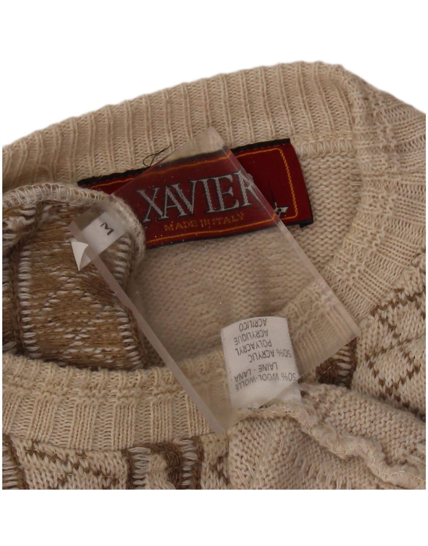 VINTAGE Pull graphique à col rond pour homme en laine rayée beige moyen
