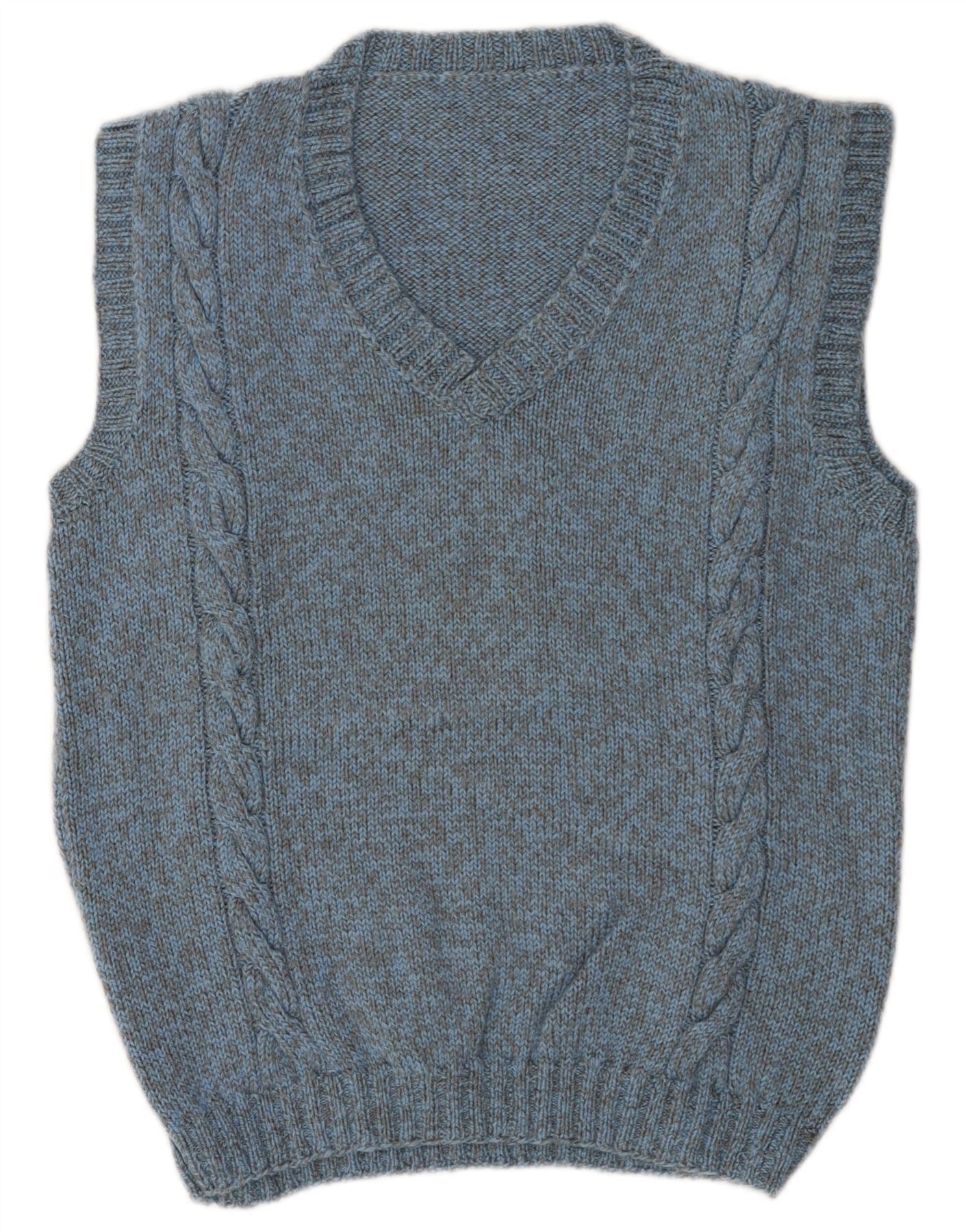 - Description de l'IA : Ce pull à col en V Vintage pour homme est confectionné dans un tissu tricoté bleu chiné. Il présente une encolure en V classique et un design sans manches. Des détails distinctifs en tricot torsadé s'étendent de chaque côté, ajoutant de la texture et un intérêt visuel. La coupe régulière assure un port confortable. Une bordure côtelée à l'ourlet et aux emmanchures complète cette pièce intemporelle et polyvalente, parfaite à superposer.