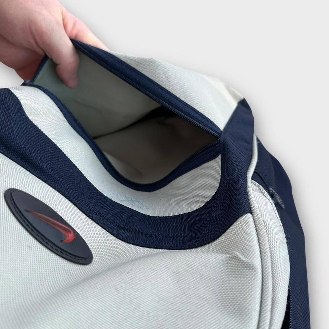 Sac à dos Nike gris clair et bleu marine du début des années 2000 avec logo brodé sur le devant