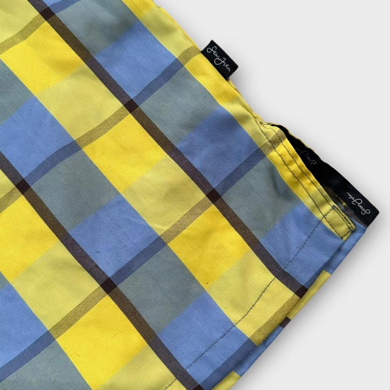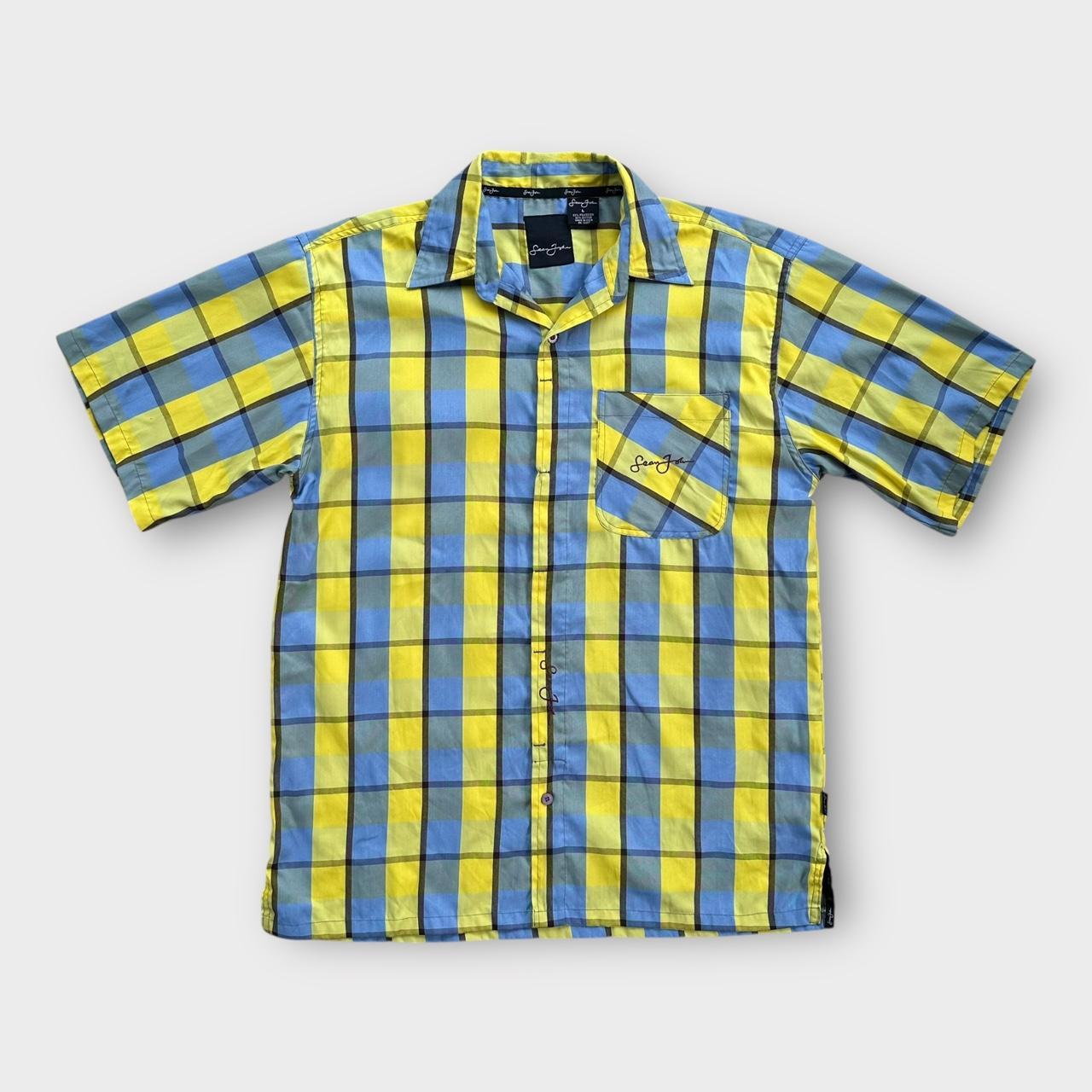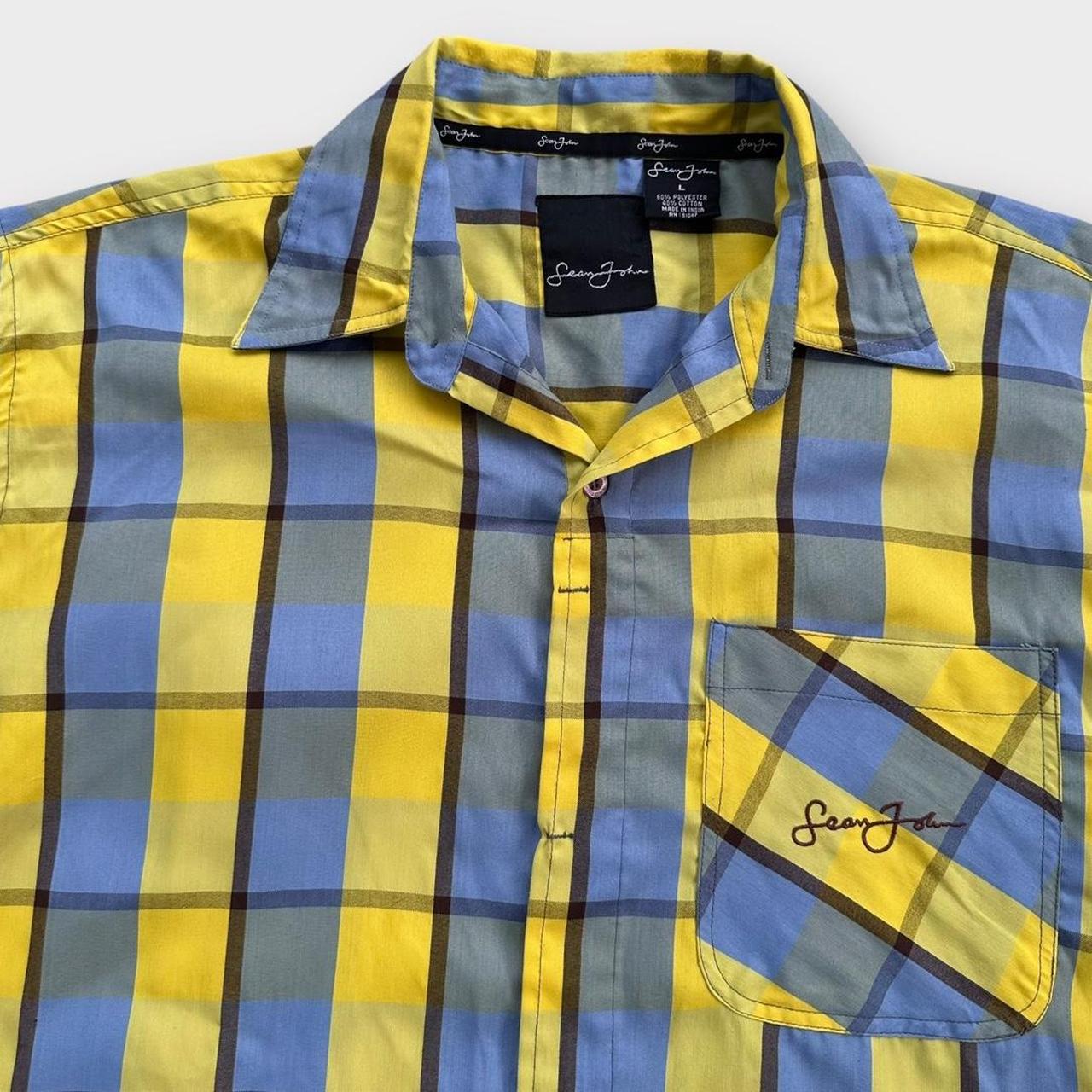 vintage début des années 2000 Sean John boutonné chemise à manches courtes en jaune et bleu avec épeler brodé sur la poche poitrine et sur le devant