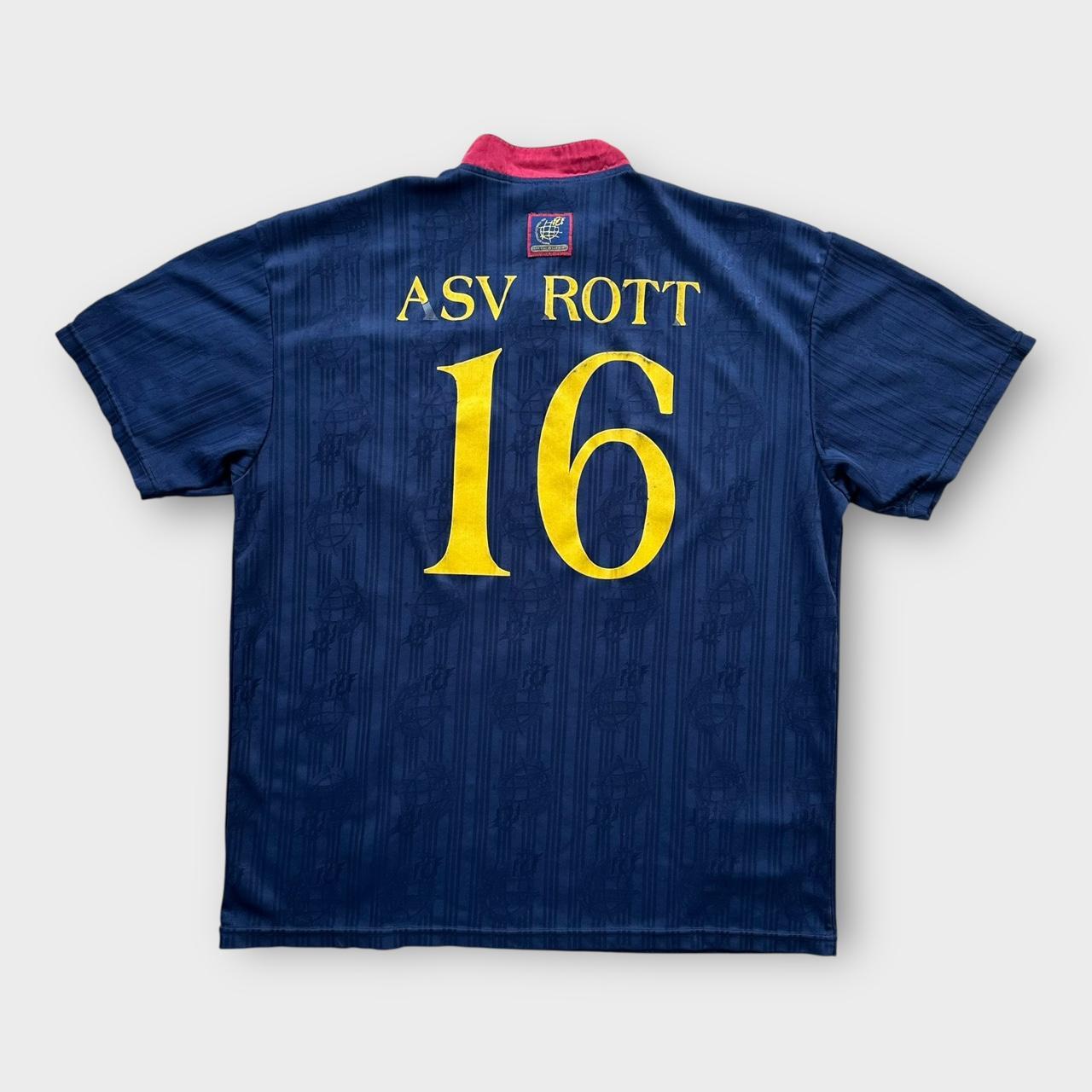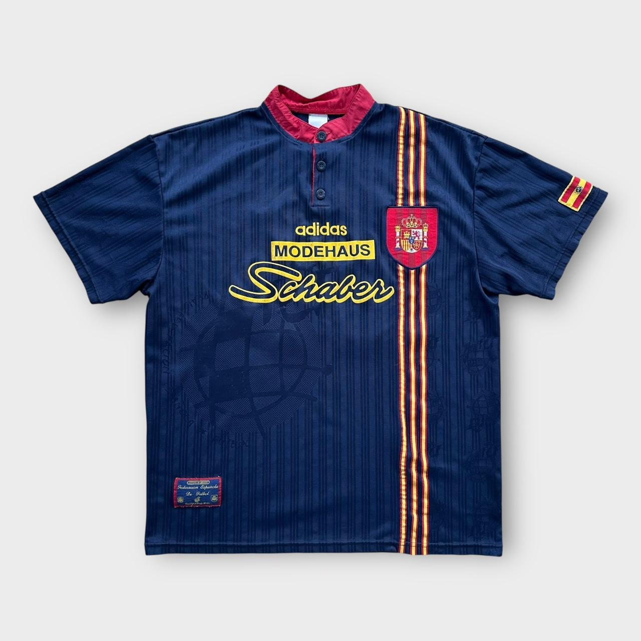 Maillot de football extérieur classique de l'Espagne 1996 par Adidas en bleu marine avec 3 bandes sur la poitrine et logo brodé. Comporte également un parrainage de tiers et un numéro au dos