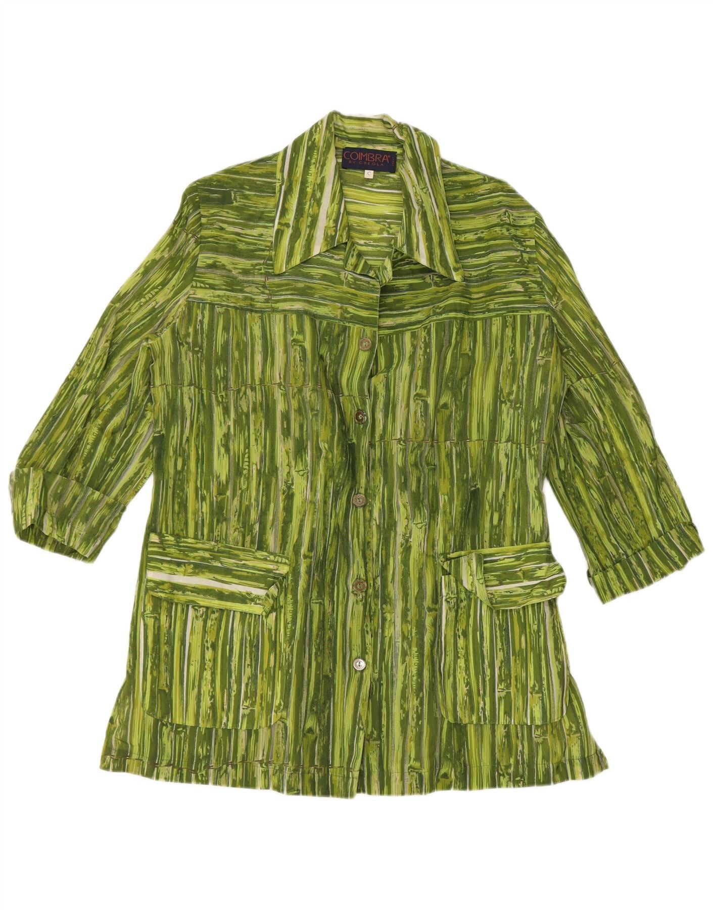 VINTAGE Femme 3/4 Manches Chemise Blouse UK 14 Viscose Rayée Vert Moyen