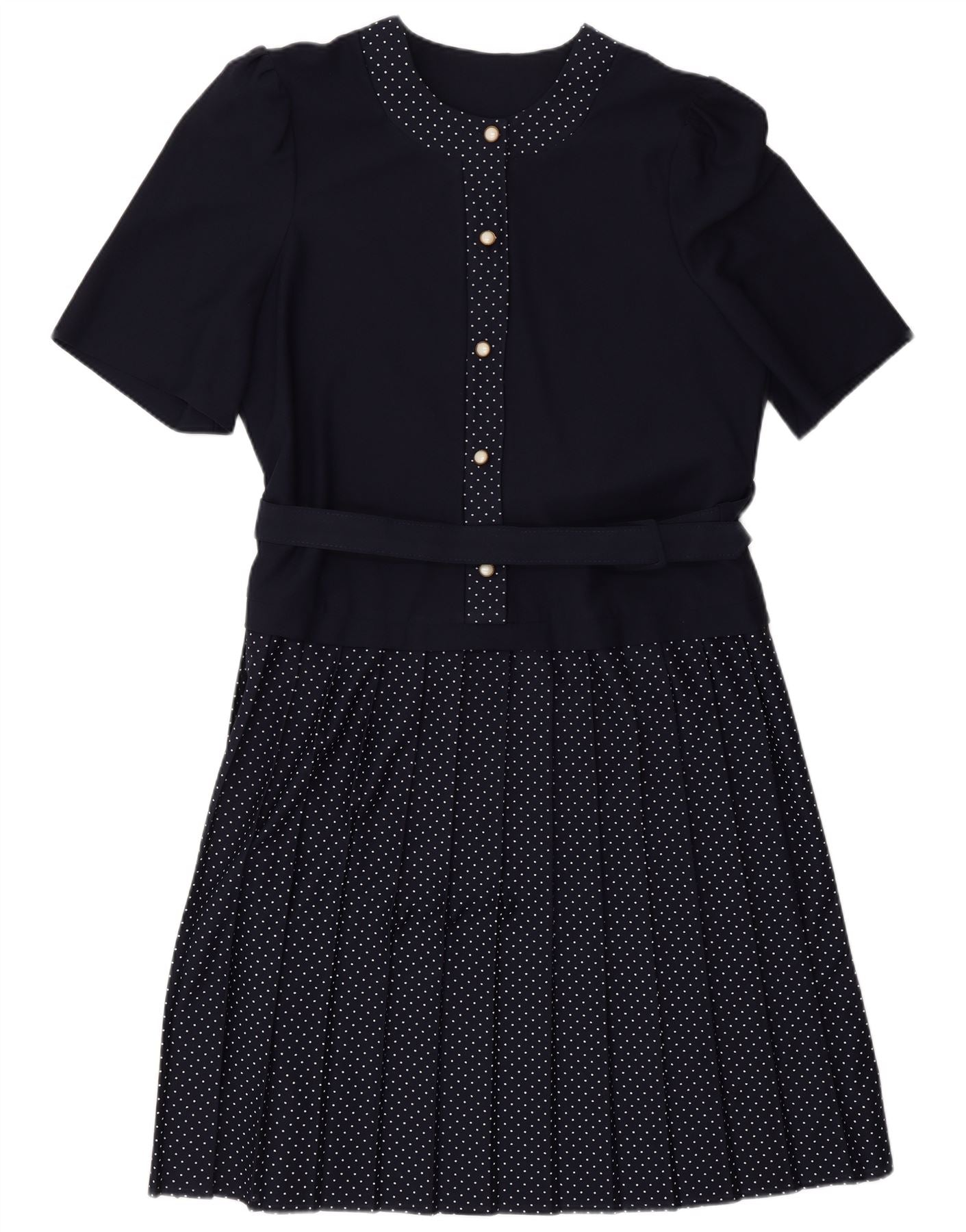 VINTAGE Robe A-Line Femme UK 16 Grand Bleu Marine Tacheté Polyester