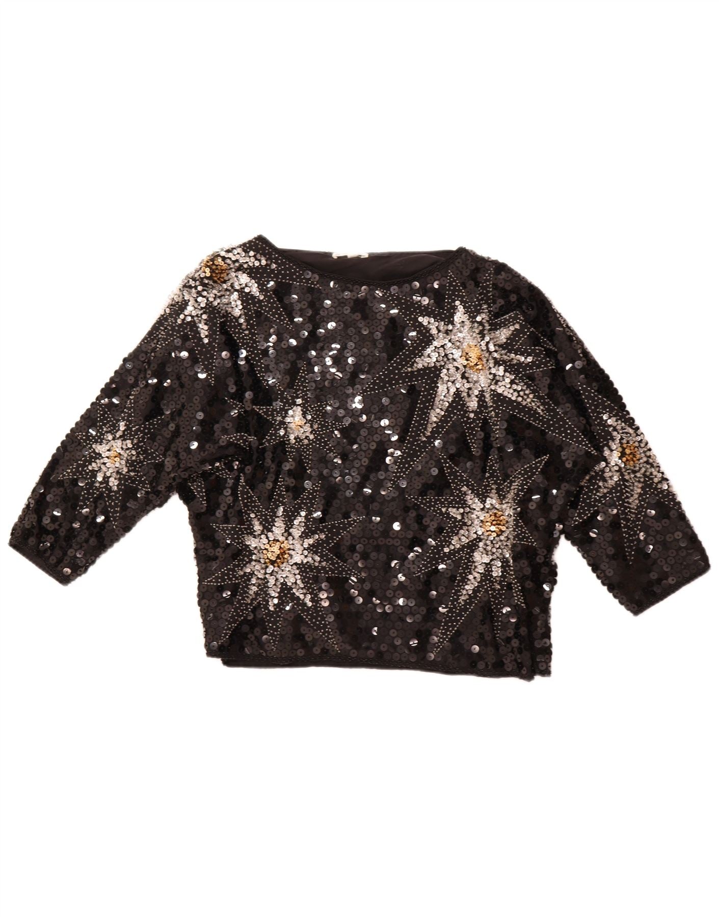 VINTAGE Femmes Motif Abstrait 3/4 Manches Blouse Top EU 42 Grand Noir