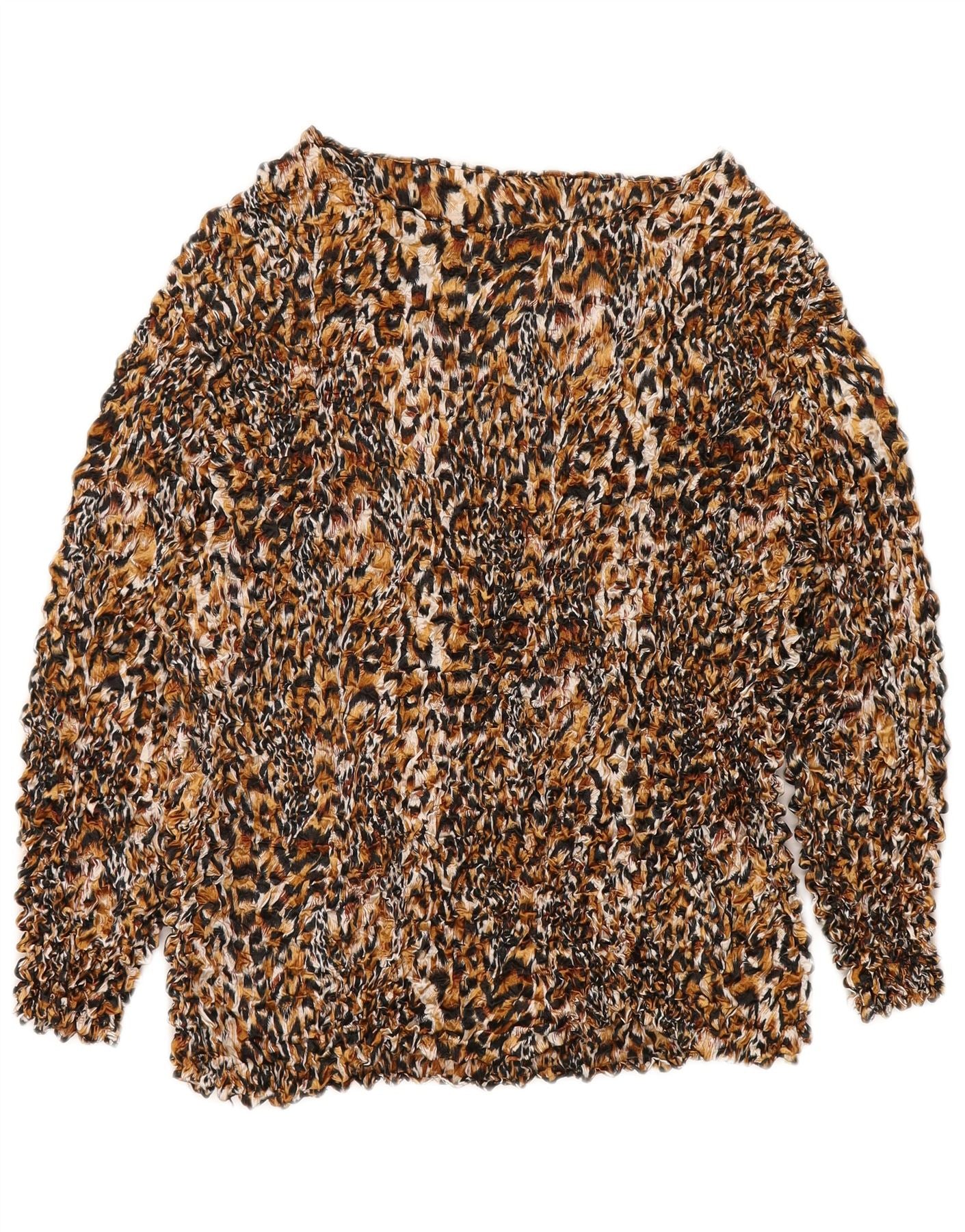 - Description de l'IA : Ce haut chemisier vintage pour femme est fabriqué à partir de 100 % de polyester avec une texture tissée et ébouriffée distinctive. Il présente un imprimé léopard multicolore vibrant, mélangeant des tons marron, noir et beige. L'encolure ronde et les manches longues offrent une silhouette classique. Conçu comme un pull, il offre une coupe régulière pour un port confortable. L'imprimé animal et la finition texturée créent une déclaration audacieuse et élégante.