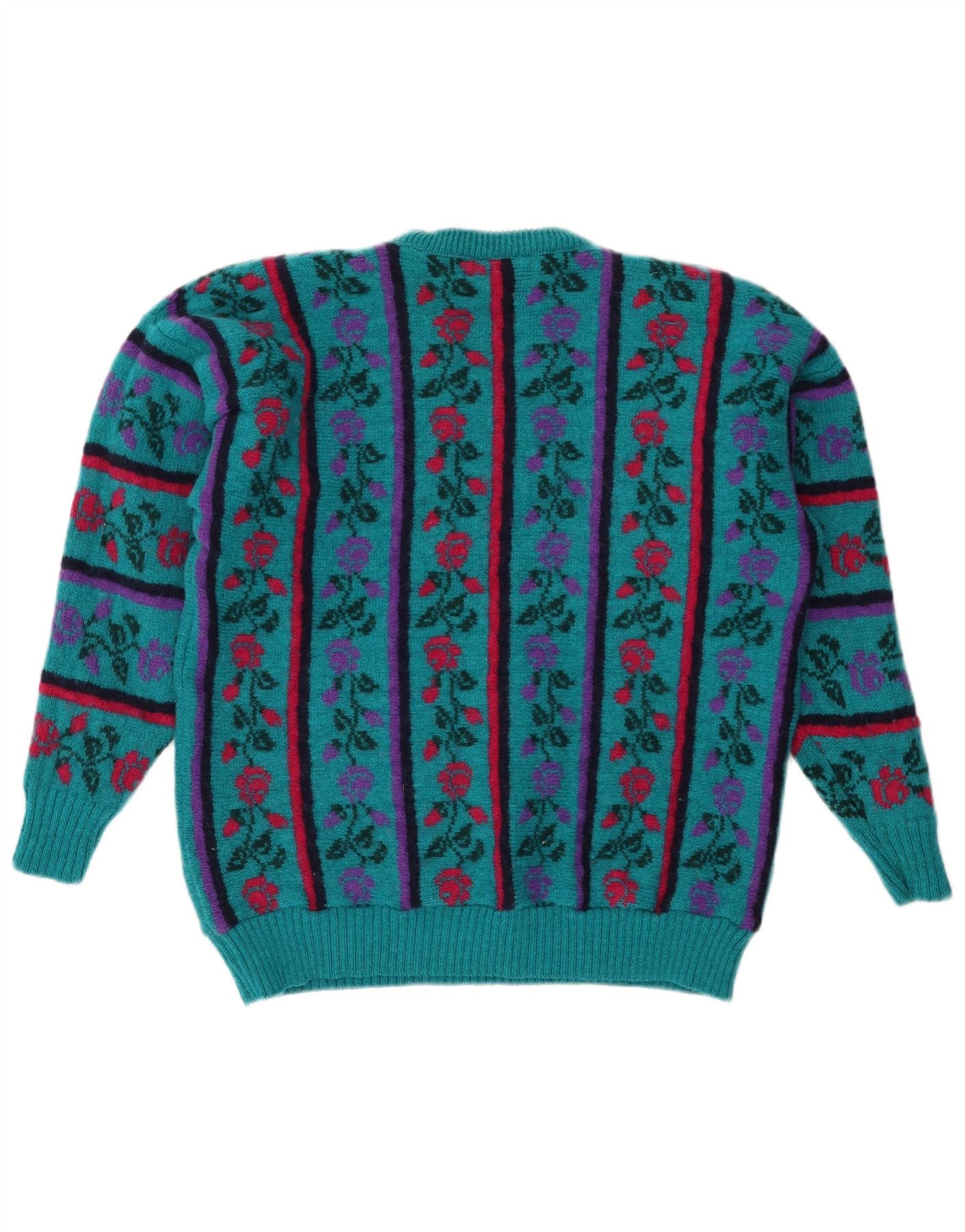 VINTAGE Femme Crew Neck Jumper Pull UK 16 Grande Laine Florale Turquoise