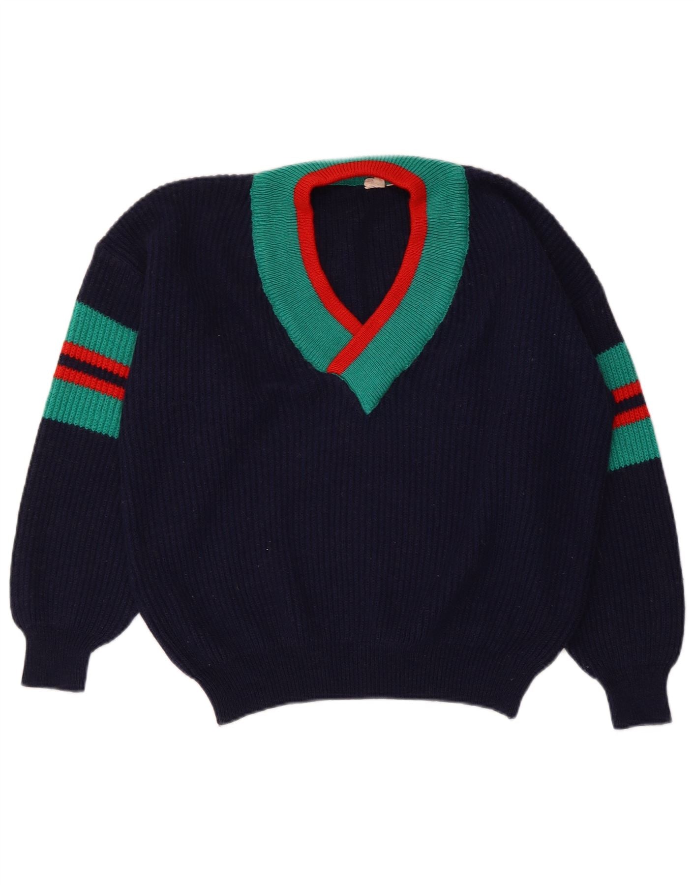 VINTAGE Femme Crop Col V Pull Pull IT 48/50 XL Bleu Marine Rayé