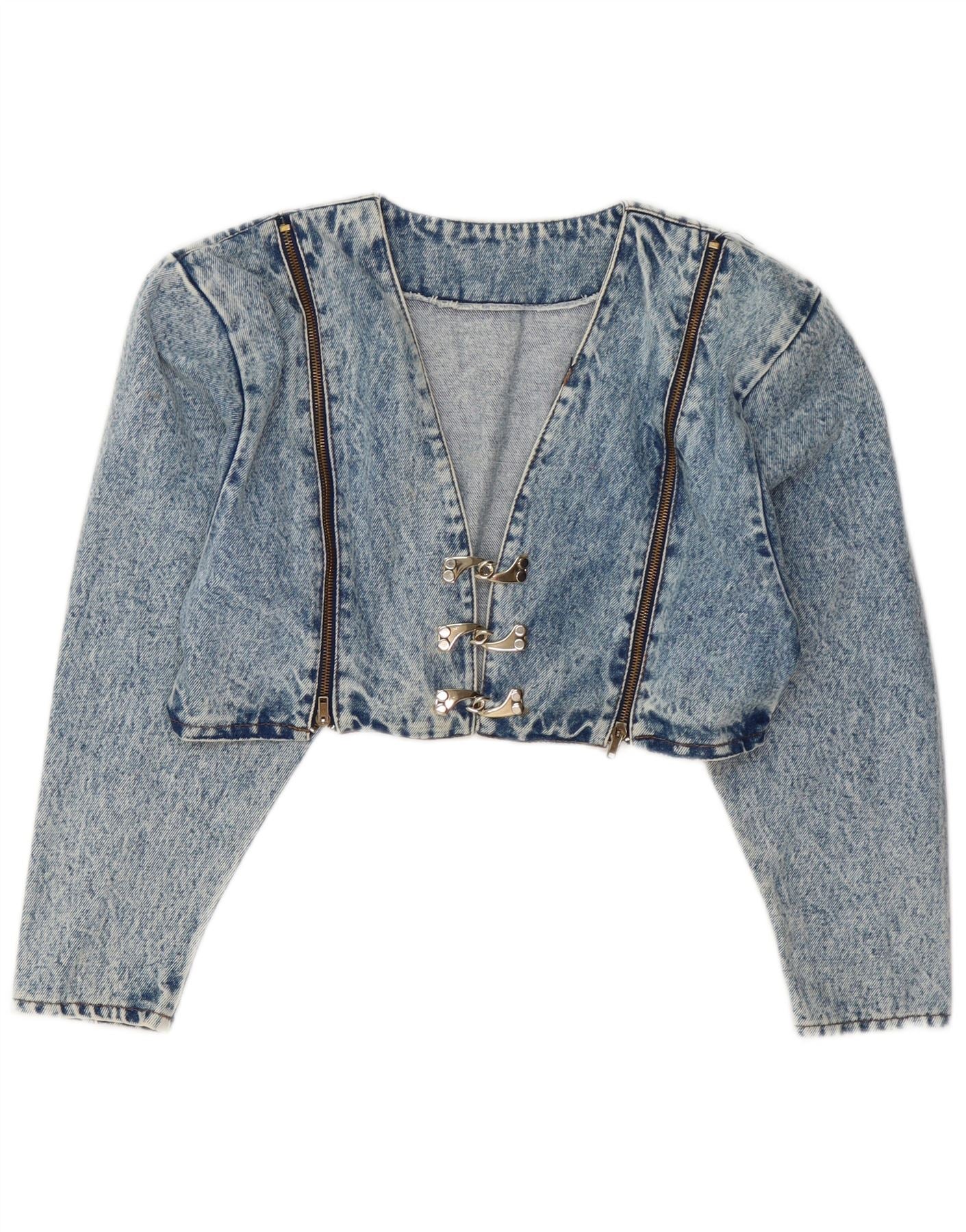 - AI Description: This Vintage womens denim jacket features a distinctive blue acid wash denim. It has a cropped length and long sleeves. The V-neckline is complemented by a hook and eye closure. Decorative zips run along the front, adding an edgy 80s style. The regular fit ensures comfortable wear.