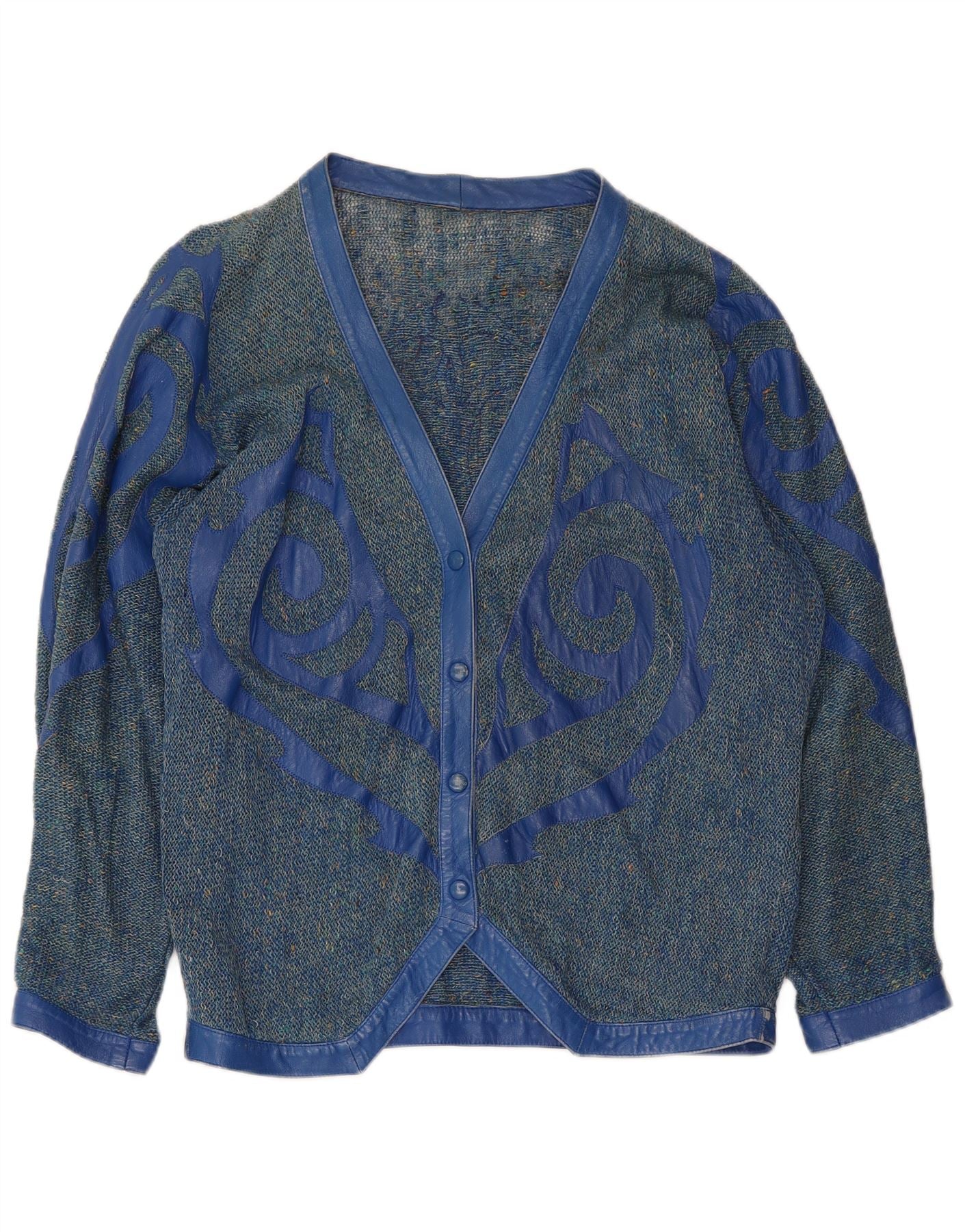 VINTAGE Femme Graphique Cardigan Pull UK 16 Grand Bleu Moucheté
