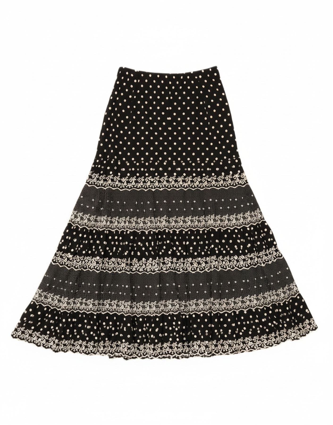 - Description de l'IA : Cette jupe longue vintage pour femme est confectionnée à partir de tissu de rayonne noir doux. Il présente un charmant motif à pois partout. Les panneaux à plusieurs niveaux présentent des détails brodés complexes et des motifs abstraits, ajoutant une profondeur visuelle. Le style bohème est évident dans son design fluide. Un ajustement confortable à la taille assure un ajustement régulier et facile. La longueur maxi crée une silhouette élégante et décontractée.