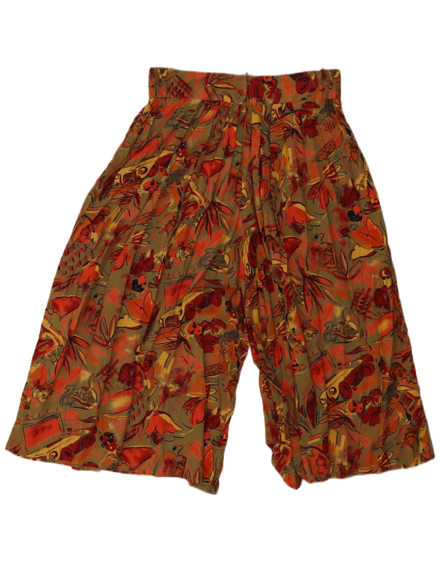 - AI Description: This Vintage womens cropped trousers are crafted from soft, flowing 100 percent viscose rayon. They feature a vibrant multicoloured floral and abstract pattern. The cullotes style offers a wide leg and a relaxed fit, perfect for comfort. A neat zip closure ensures a smooth front. The tropical aesthetic brings a lively, casual charm.