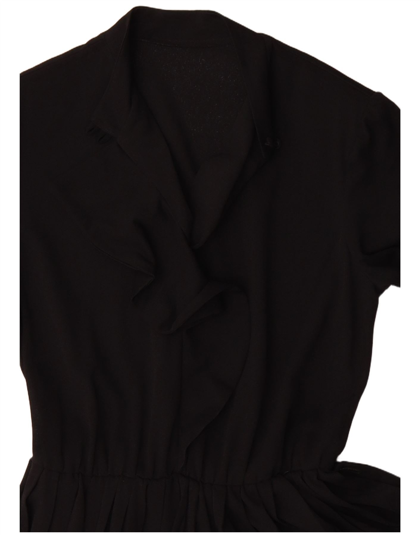 - Description de l'IA : Cette robe vintage pour femme est confectionnée à partir d'un tissu tissé noir. Il présente une encolure à col et des manches longues pour une couverture élégante. Le design du pull comprend un détail volanté sur le corsage. Une taille élastiquée définit la silhouette, menant à une jupe plissée classique. Cette robe coupe classique offre un look intemporel et structuré. L'accent volanté ajoute une touche de charme féminin, parfait pour un ensemble sophistiqué.