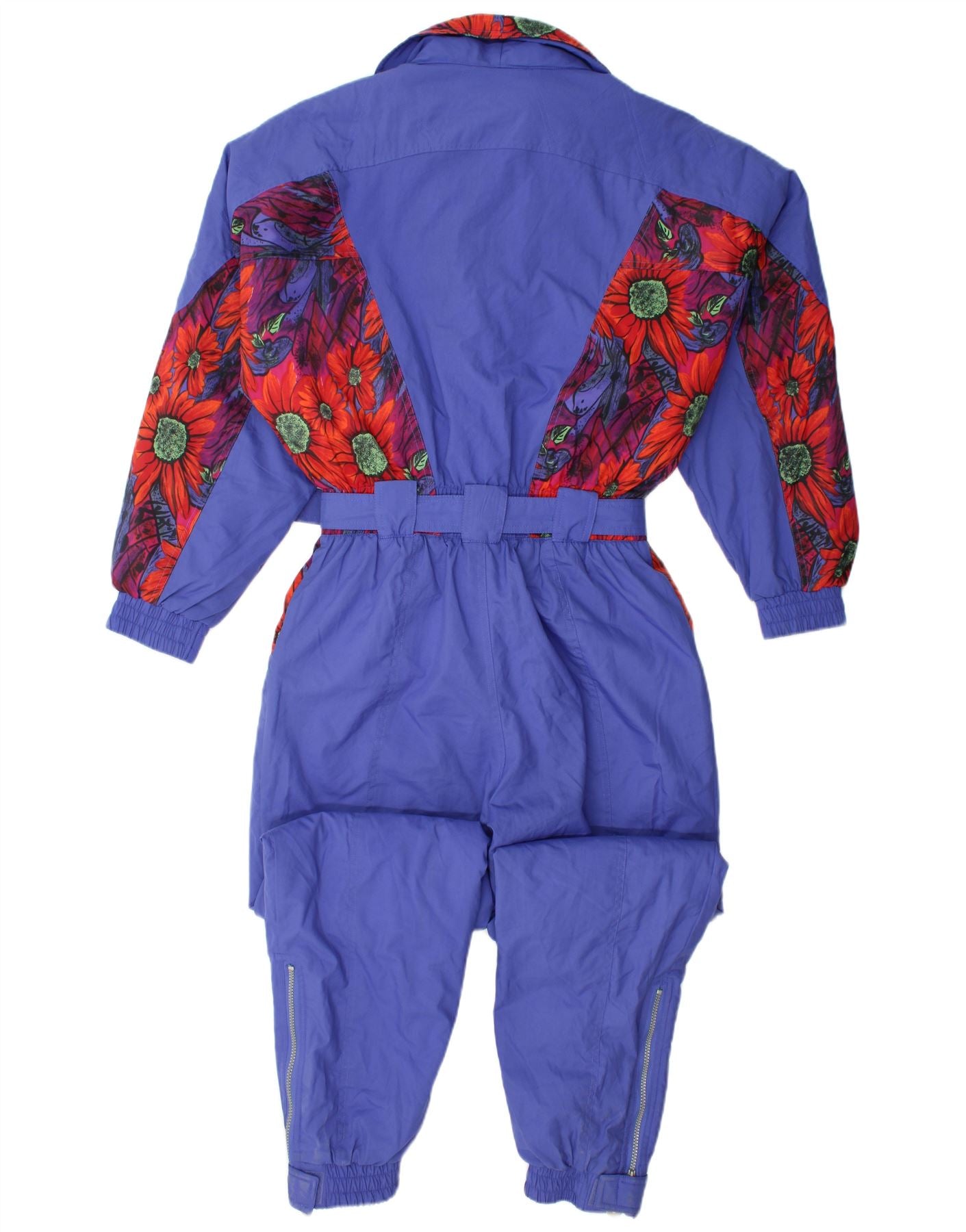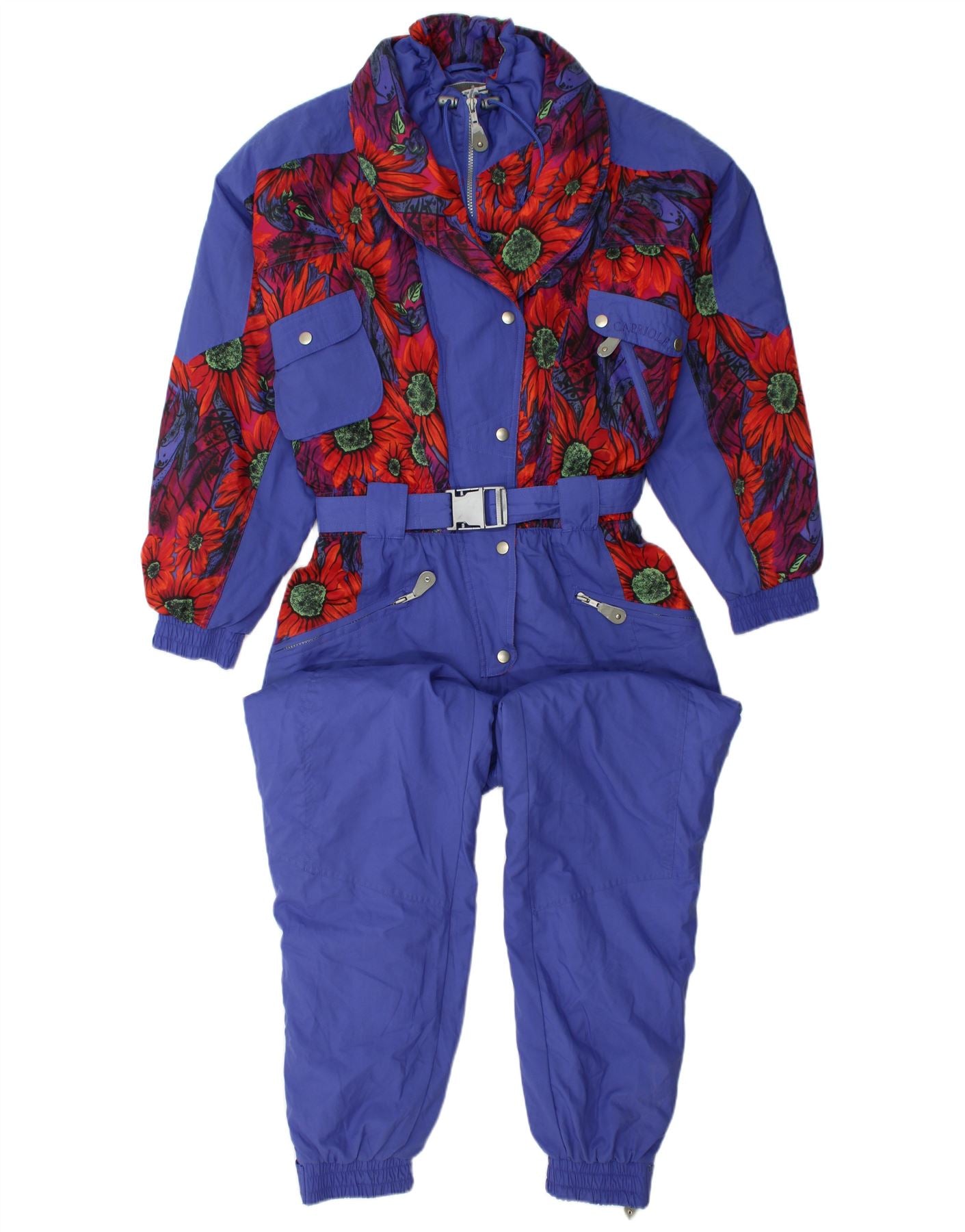 - AI Description: This Capriote By Golden Team womens ski jumpsuit is crafted from durable woven fabric, ideal for the slopes. It features a vibrant, crazy floral pattern in blue and multicoloured tones. The collared neckline and long sleeves provide full coverage. A full zip closure secures the front. It boasts a regular fit, cinched by a stylish belt with a buckle accent. Zipped pockets offer practical storage. This retro-inspired piece combines functionality with a bold, eye-catching design.