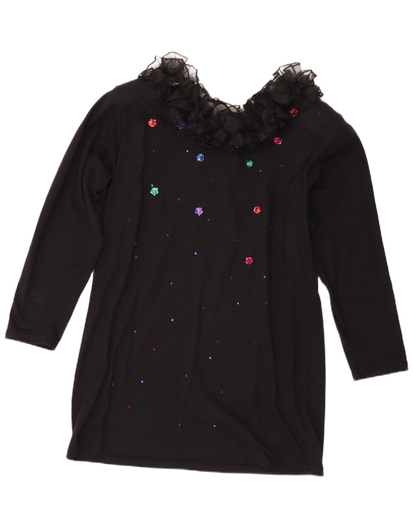 vintage Femmes Ruffle Front Manches Longues Tunique Top UK 16 Grand Coton Noir