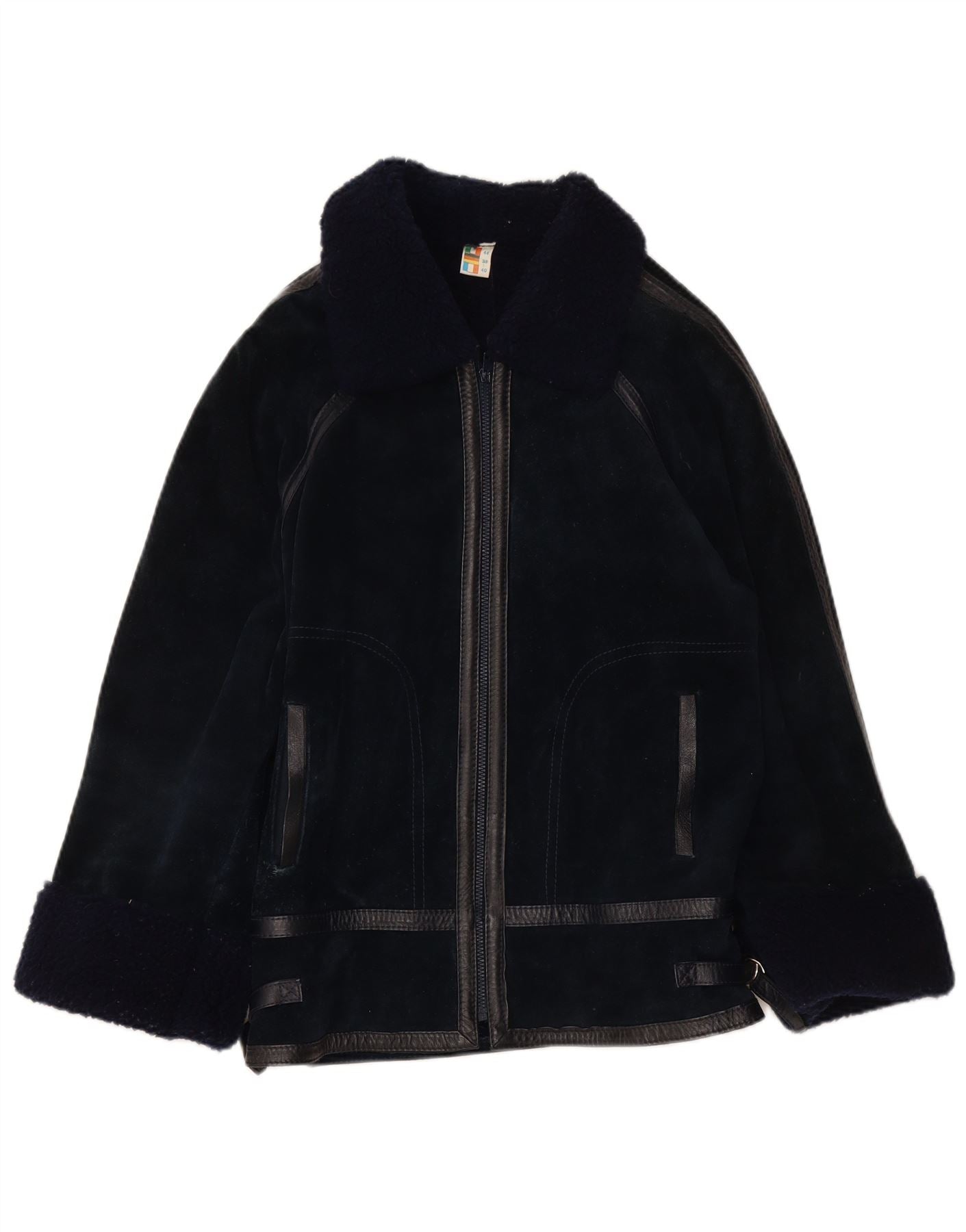 VINTAGE Veste Shearling Femme IT 44 Cuir Bleu Marine Moyen