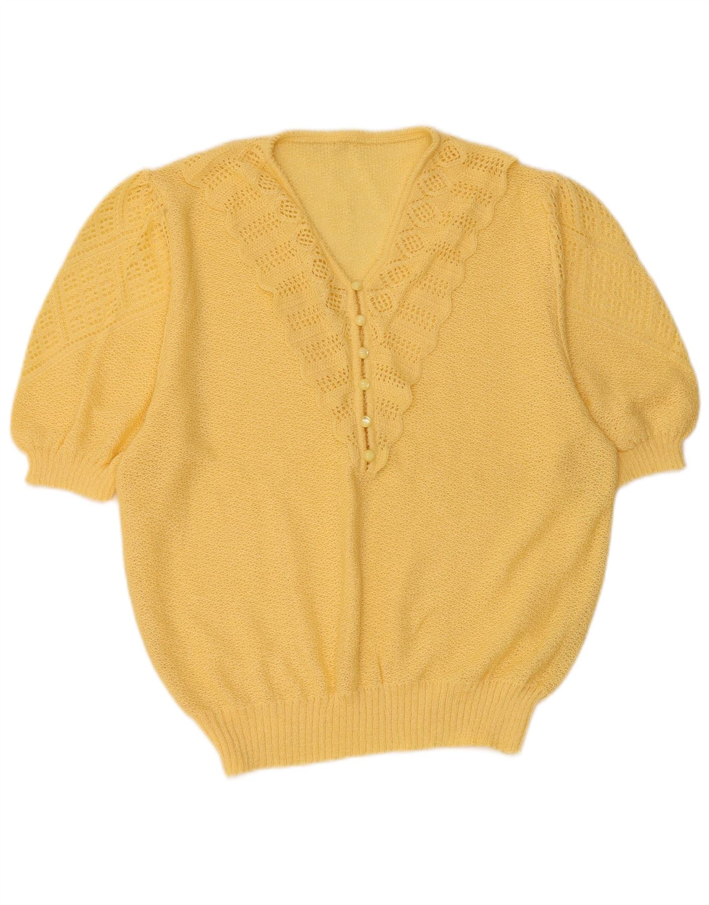 VINTAGE Pull à manches courtes et col en V pour femme UK 16 Grand Jaune