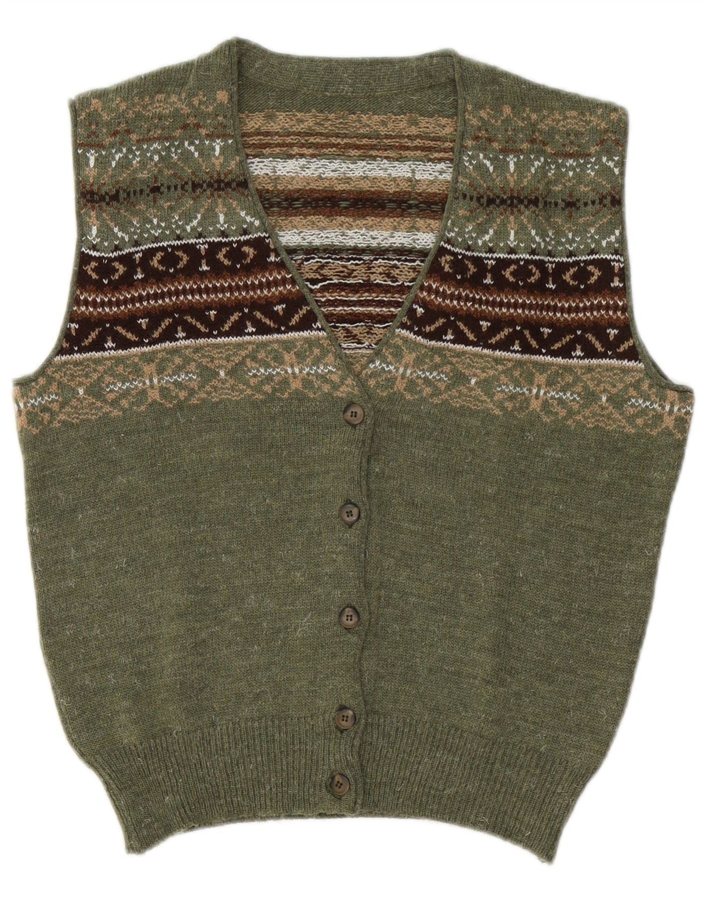 VINTAGE Pull cardigan sans manches femme UK 14 Vert moyen Fair Isle