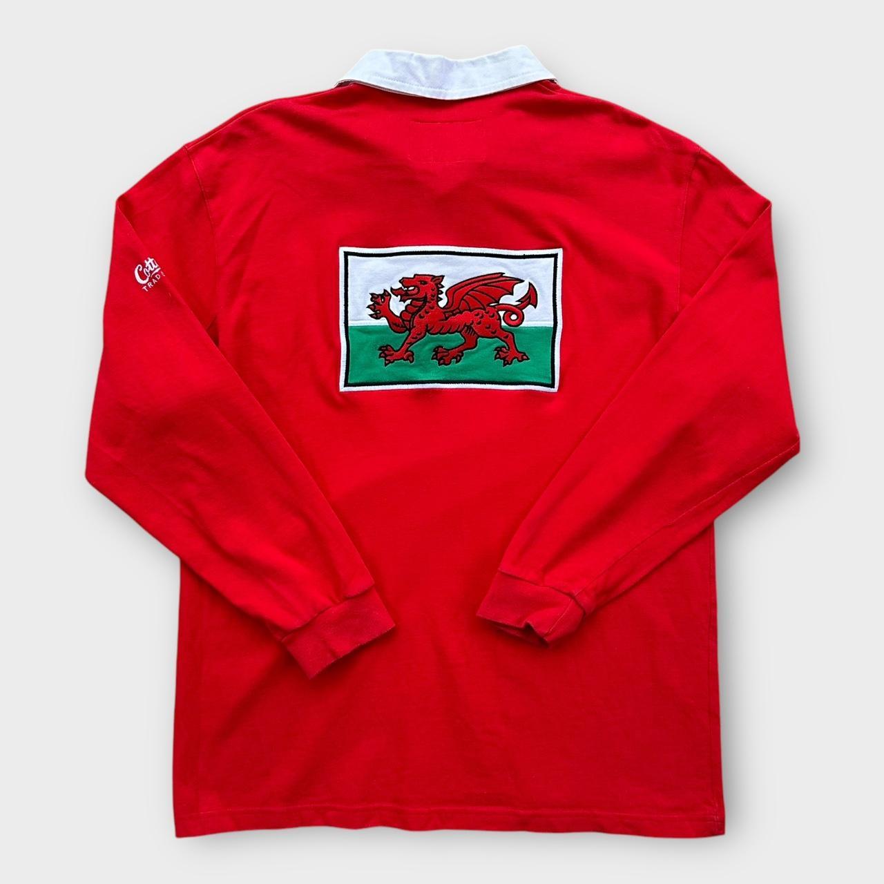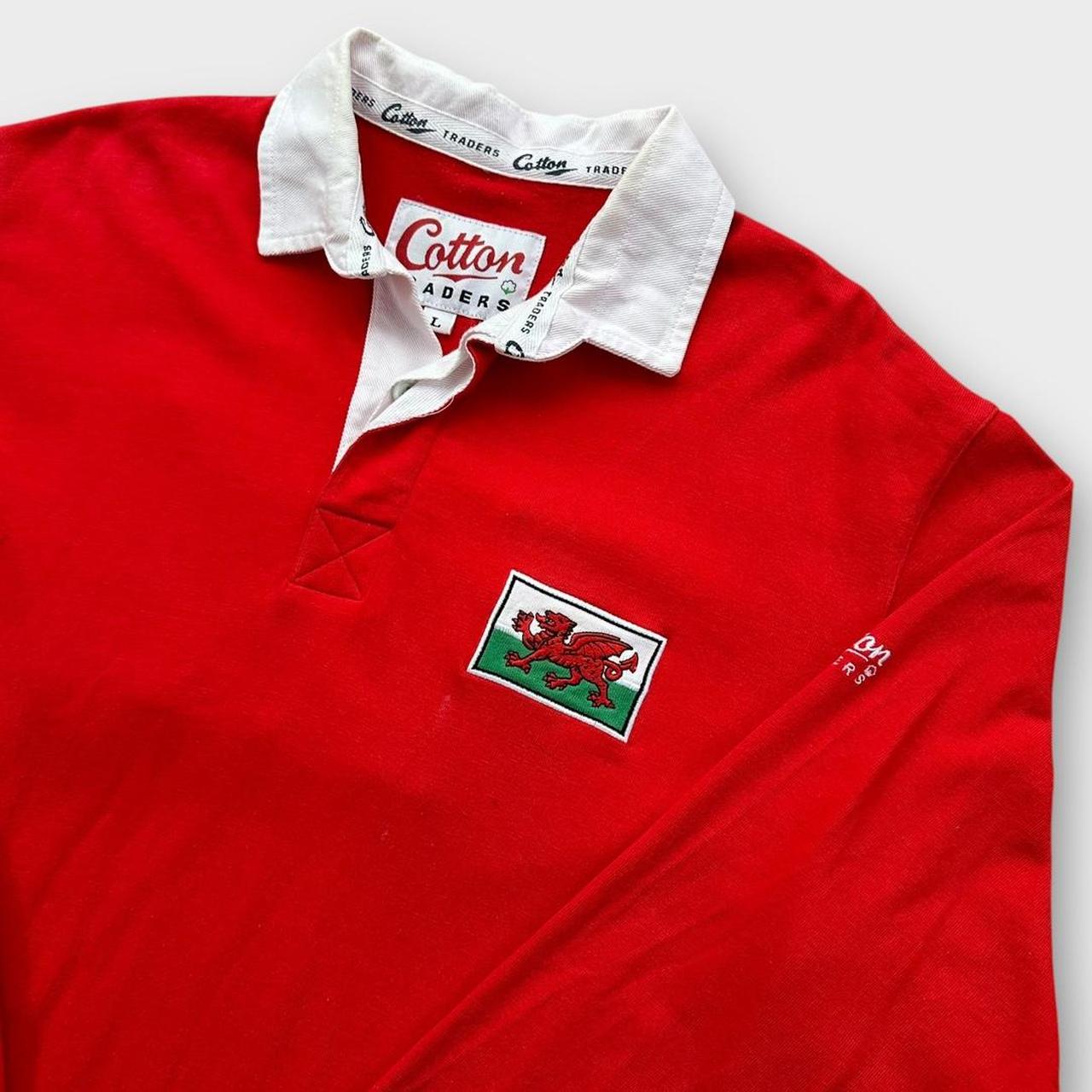Haut de rugby gallois vintage des années 90 par des commerçants de coton en rouge et blanc avec logos brodés sur la poitrine et dans le dos