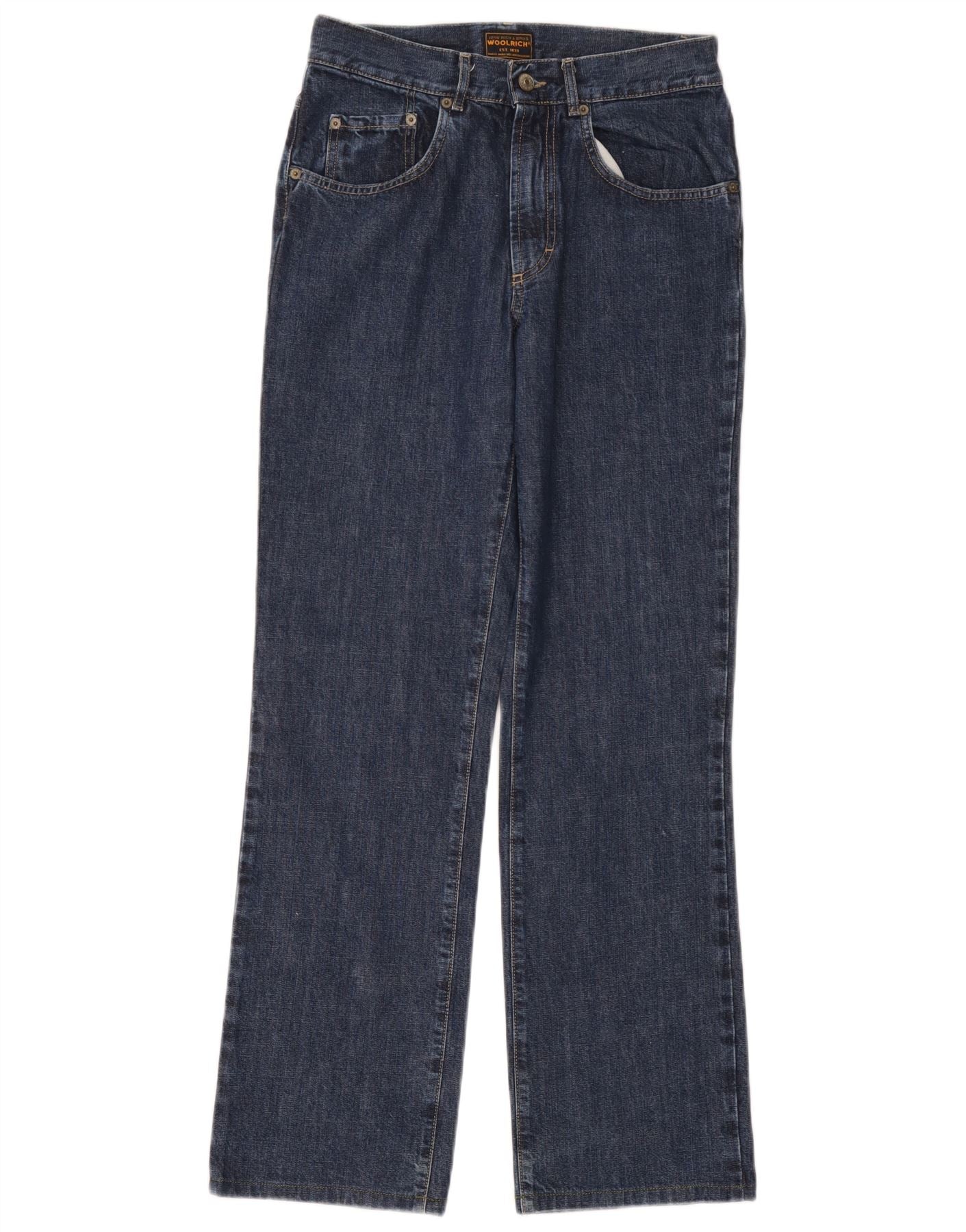 - Description de l'IA : Ce jean droit Woolrich pour femme est confectionné dans un denim bleu marine durable, composé à 100 % de coton. Ils présentent une taille mi-haute classique et une fermeture zippée pour un devant lisse. La coupe régulière offre un port confortable. Les jambes droites maintiennent une largeur constante de la hanche à la cheville. Des poches pratiques sont incluses et un subtil logo de la marque ajoute une touche signature.