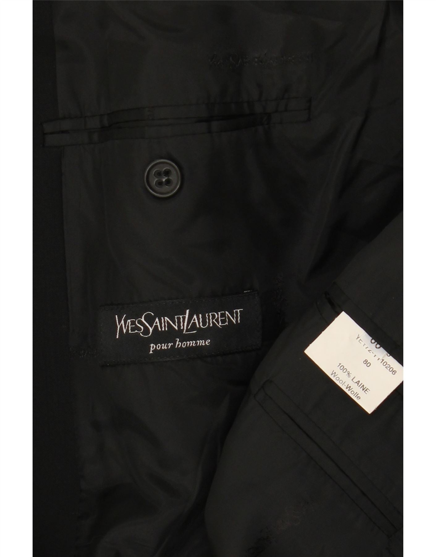 - AI Description: This Yves Saint Laurent mens blazer jacket is expertly crafted from 100 percent woven black wool. The luxurious material offers a refined texture and smart appearance. It features a classic collared neckline and a sophisticated three-button front closure. Long sleeves and multiple pockets complete the timeless design. The regular fit ensures a comfortable yet tailored silhouette, perfect for professional or formal occasions.