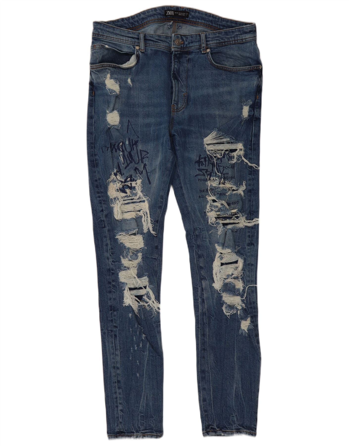 ZARA Jean slim graphique vieilli pour homme EU 44 Large W34 L30 Bleu