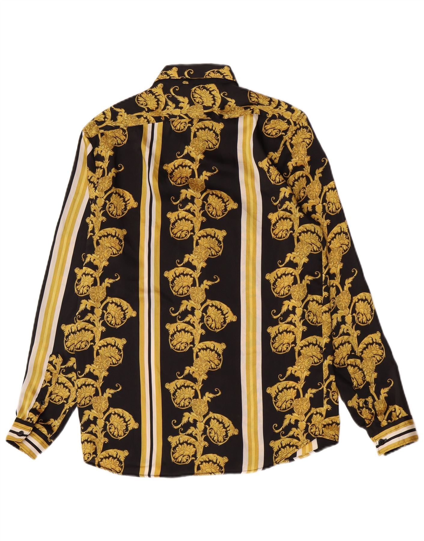 - Description de l'IA : Cette chemise pour homme Zara est confectionnée dans un tissu tissé lisse, présentant un superbe motif orné de noir et d'or. Les rayures verticales dorées et blanches ajoutent un intérêt visuel. Il a une encolure à col classique et un devant entièrement boutonné. Manches longues terminées par des poignets boutonnés soignés. La coupe régulière assure un port confortable et une silhouette intemporelle.
